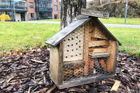 Katselemme yksinäistä hyönteishotellia Aleksandra Siltasen puistossa. Nousiainen pohtii, että Pelasta pörriäinen -kampanja on tehnyt paljon hyvää ja lisännyt hyönteisten arvostusta.