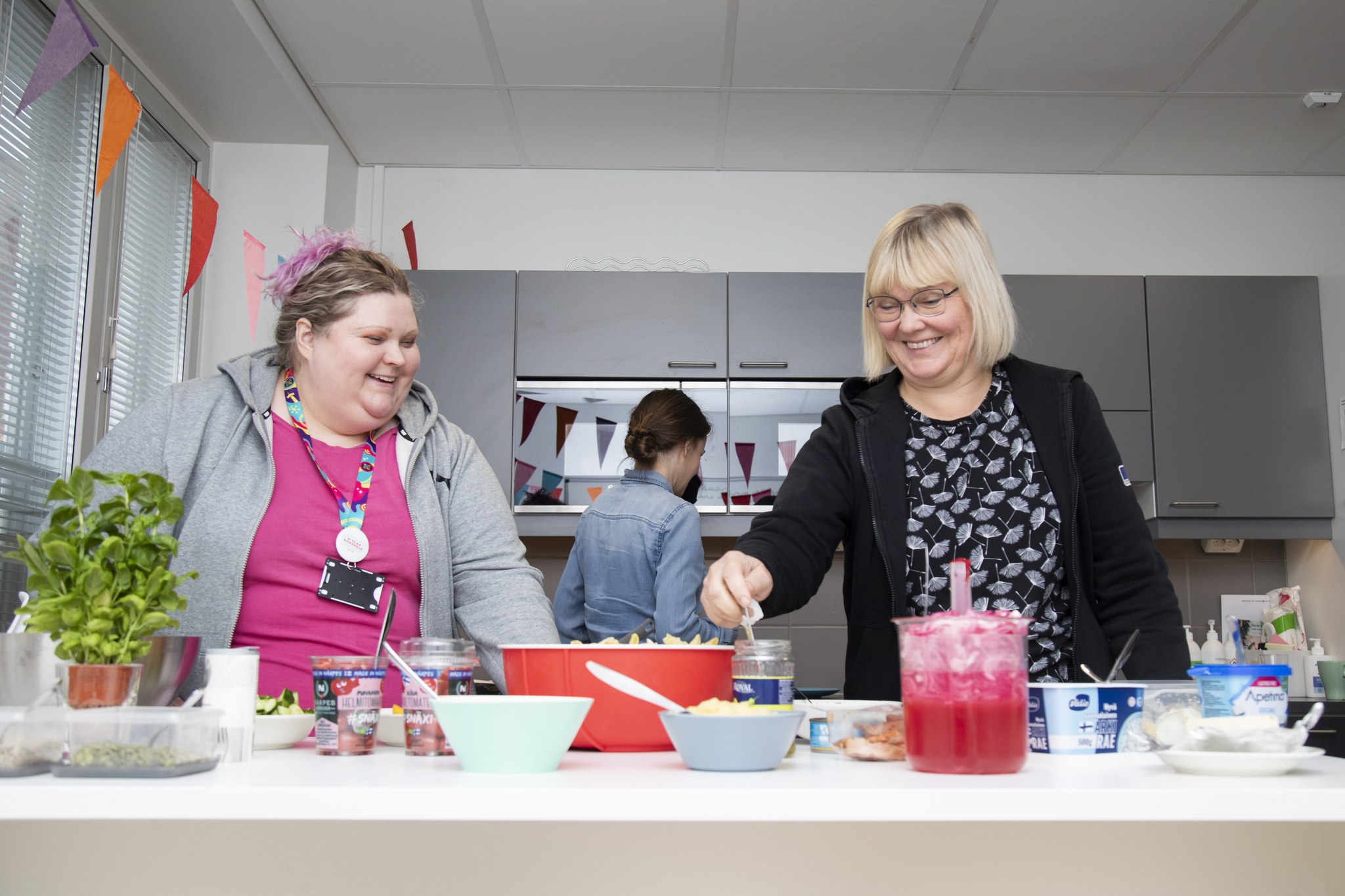 Nuorten palvelupiste Ohjaamon henkilökunta nauttii kerran kuussa yhteisen salaattilounaan tiimipalaverin jälkeen. Jokainen tuo jotakin yhteiseen salaattibuffetiin, ja usein pöytään on katettu myös jälkiruokaa.