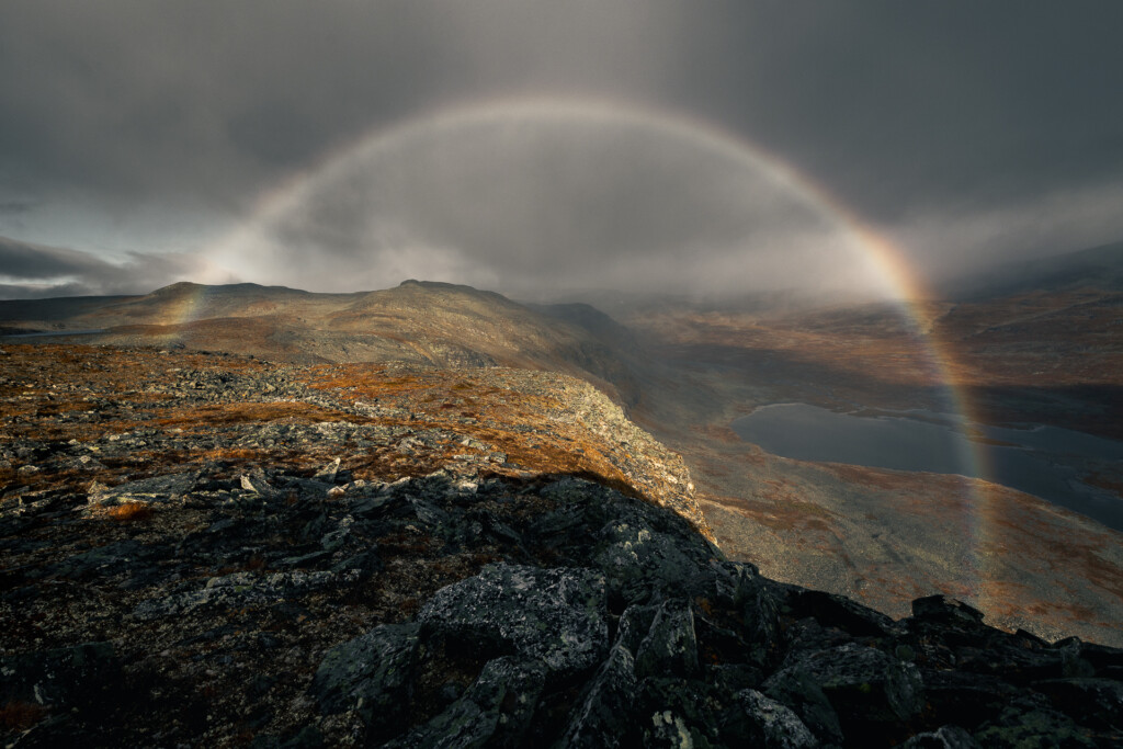 -Räntäsadekuurojen pyyhkiessä yli aurinko pilkahteli pilvien takaa ja muodosti sateenkaaren tunturijonon ympärille, Jetro valottaa.