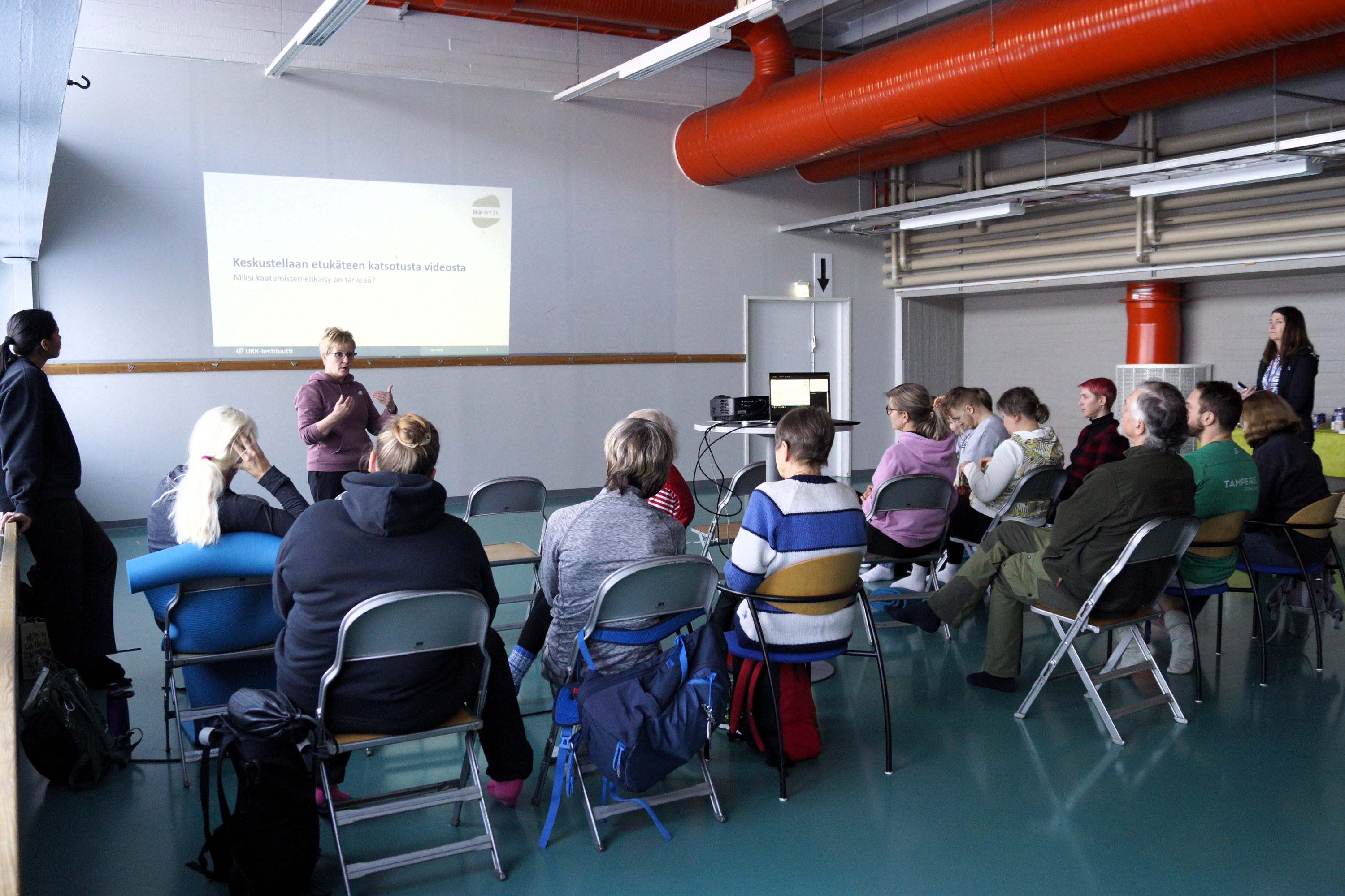 Tammikuussa oli vuorossa toinen työpaja, jossa aiheena oli liikuntapalvelujen asiakkaiden erilaisten toimintakykytasojen tunnistaminen ja kaatumisia ehkäisevä liikuntaharjoittelu. Työpajaan osallistujat muun muassa pääsivät kokeilemaan erilaisia tasapainoa, alaraajojen lihasvoimaa ja kehonhallintaa mittaavia testejä, jotka auttavat arvioimaan, millainen liikuntaharjoittelu asiakkaalle sopii sekä mahdollista kaatumisriskiä.