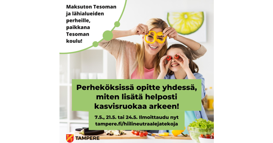 Hiilineutraaleja tekoja -kehitysohjelma tarjoaa Tesoman, Raholan, Tohlopin ja Ikurin asukkaille mahdollisuuden osallistua maksuttomiin Perheköksiin toukokuussa Tesoman koululla. Jokaisella Perheköksäkerralla valmistetaan yhdessä kokkaillen erilainen kasvipohjainen ateria. Lopuksi päästään nauttimaan itsetehtyjä ruokia.