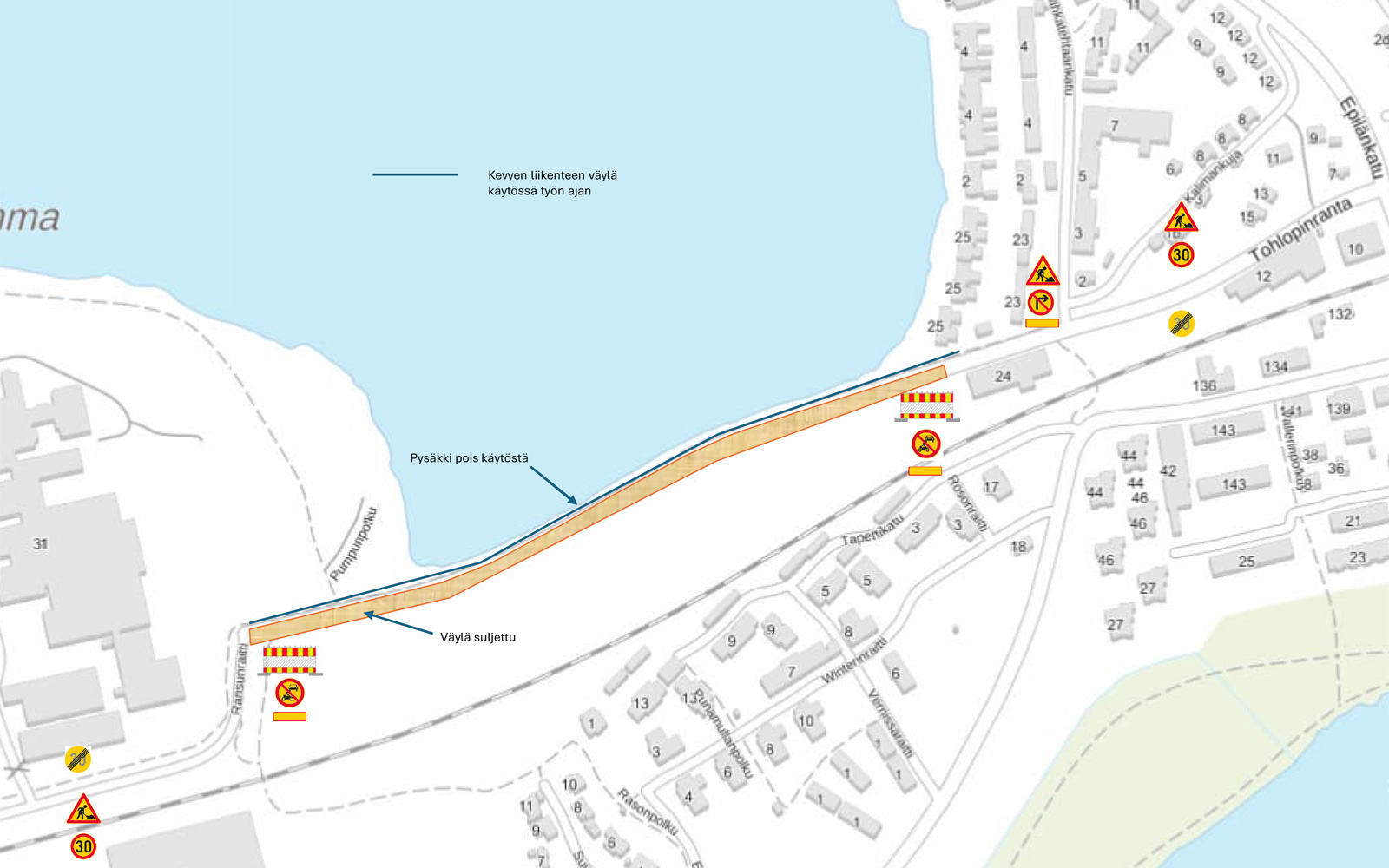 Tohlopinranta suljetaan moottoriajoneuvoliikenteeltä Mediapoliksen kohdalta Ransunraitilta Nahkatehtaankadulle saakka maanantaista 3.6.2024 sunnuntaihin 9.6.2024 asti. Väylällä uusitaan hulevesi- ja jätevesilinja, jonka takia väylälle joudutaan kaivamaan syvä kaivanto. Jalankulkijat ja pyöräilijät pääsevät kulkemaan työmaan ohi.