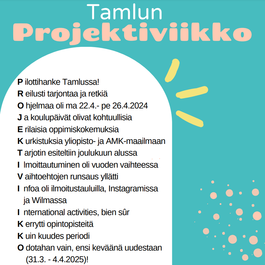 Tammerkosken lukiossa vietettiin projektiviikkoa 22.-26.4.2024. Opiskelijoille oli tarjolla monipuolista ja erityistä ohjelmaa 1-2 opintopisteen verran. Projektiviikkoa vietettiin mm. antiikin Ateenassa, taidematkalla Lontoossa, Ruotsissa ruotsin kieltä harjoitellen, Reunionin luonnossa, historiaa harrastaen, matematiikkaa kerraten, matkalla kohti inttikuntoa tai musatekniikkaa opiskellen.