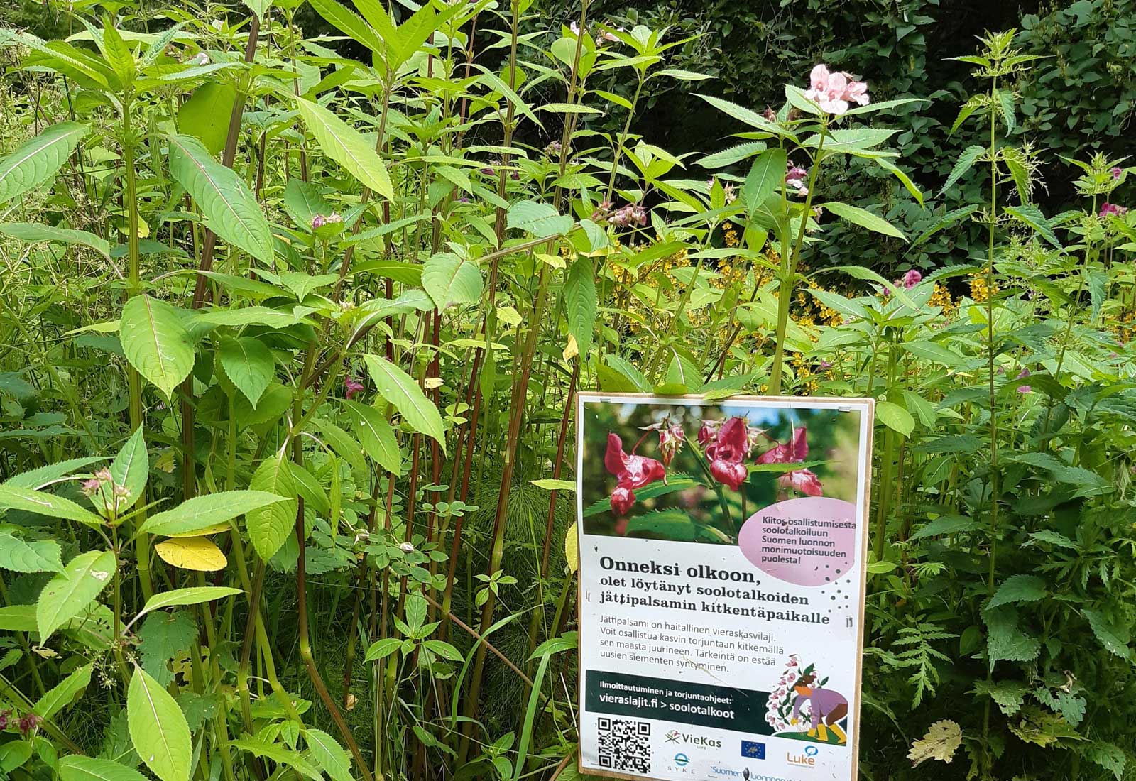 Voit talkoilla kesän aikana yksin, pienellä tai isommalla porukalla. Vieraslajien torjuntaan tarvitaan maanomistajan lupa, ja kaupunki onkin osoittanut jättipalsamiesiintymiä, joilla voi talkoilla. Jättipalsamin soolotalkookohteet on merkitty myös kyltein maastoon kesäkuun alussa.