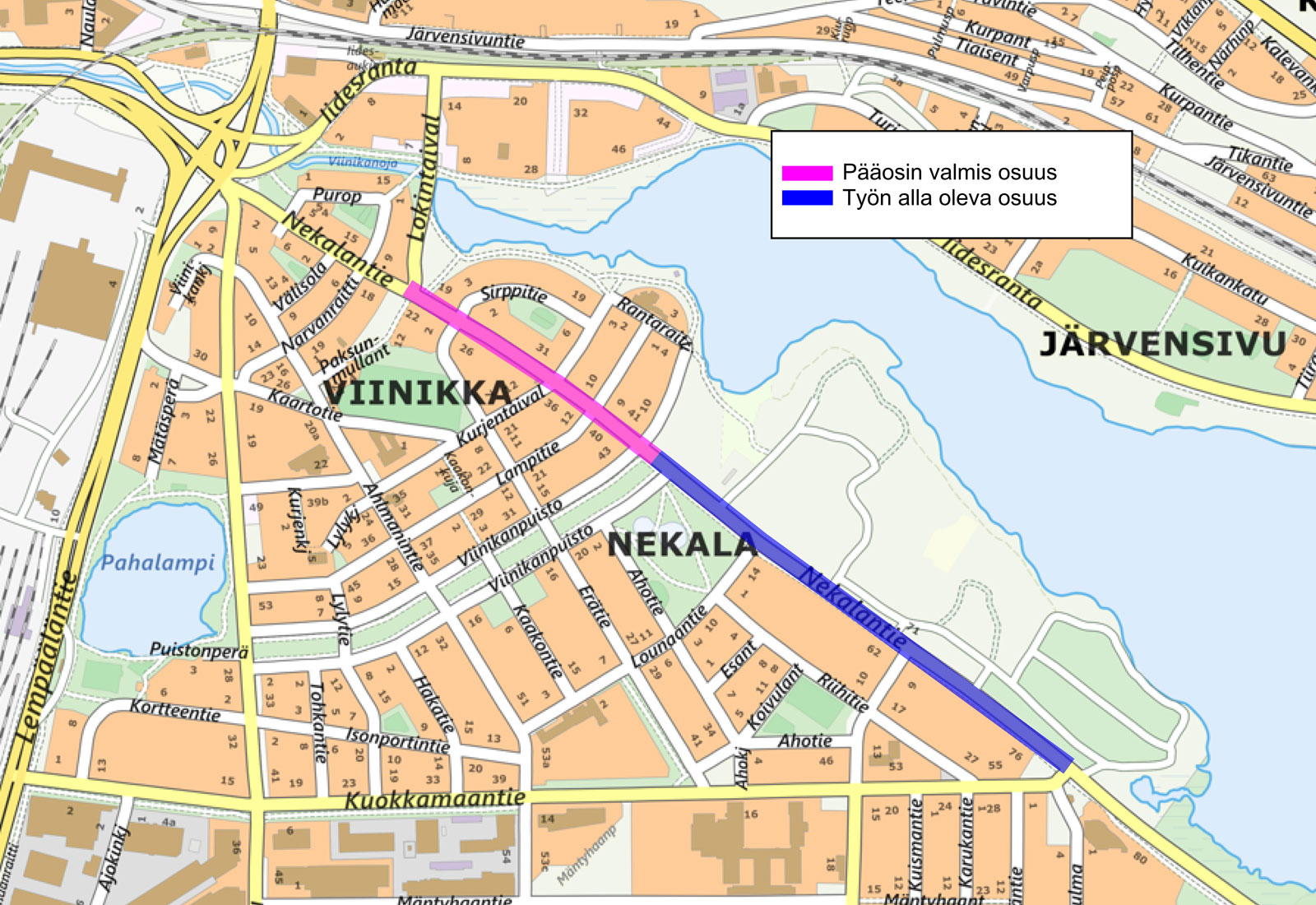 Katuosuudella Viinikanpuisto - Kuokkamaantie rakennetaan reunakivi- ja hulevesirakenteita ajoradalla sekä tehdään päällysrakennetöitä. Jalankulkijat ja pyöräilijät pääsevät kulkemaan normaalisti nykyisellä Nekalantien pohjoispuolella jalkakäytävällä ja pyörätiellä. Ajorataa kavennetaan työn aikana tarpeen mukaan, jotta työt voidaan suorittaa turvallisesti.