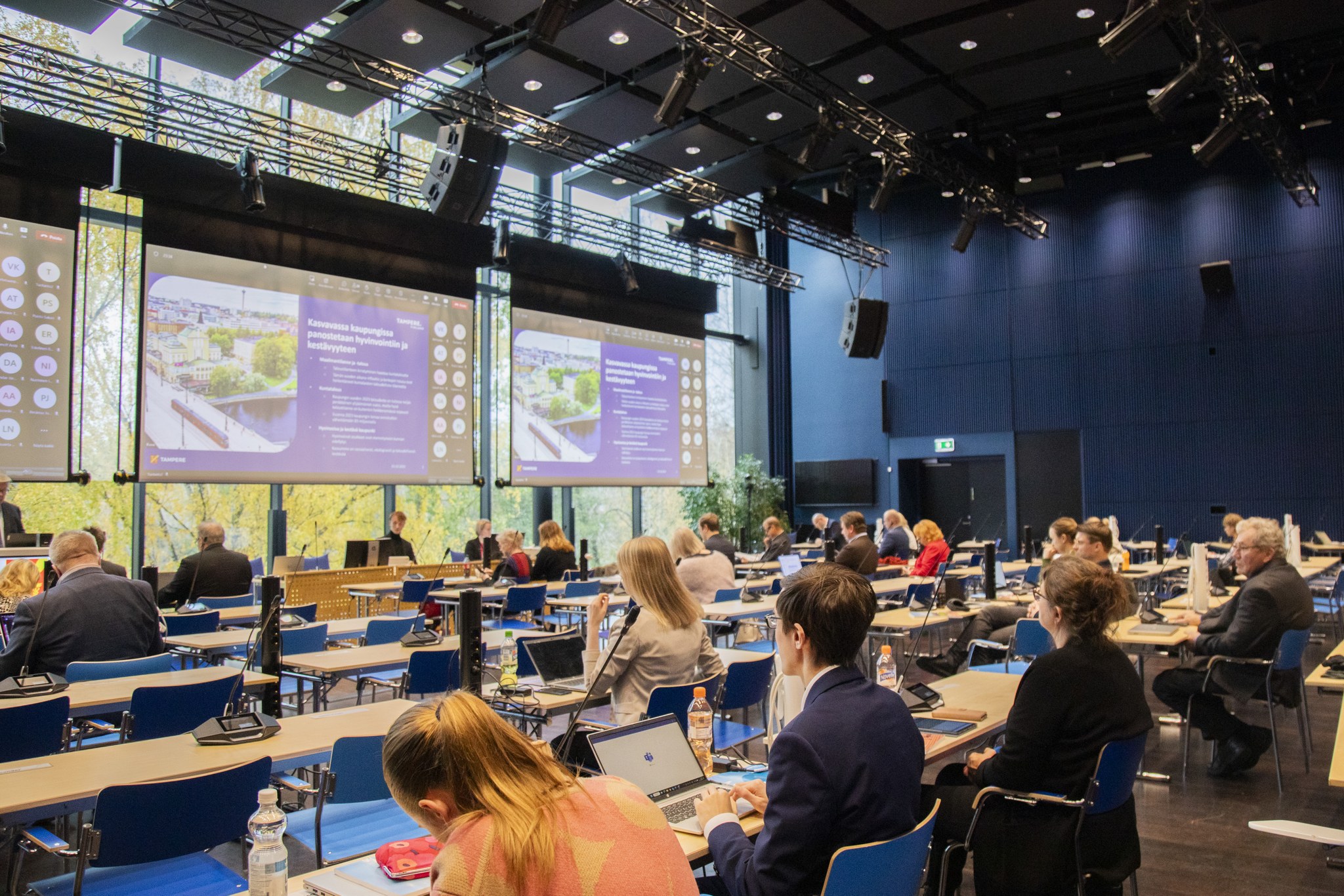 Valtuuston kokouslähetystä voi Tampere.fi-verkkosivun lisäksi seurata myös Tampere-talon pääaulan yleisökatsomossa.
