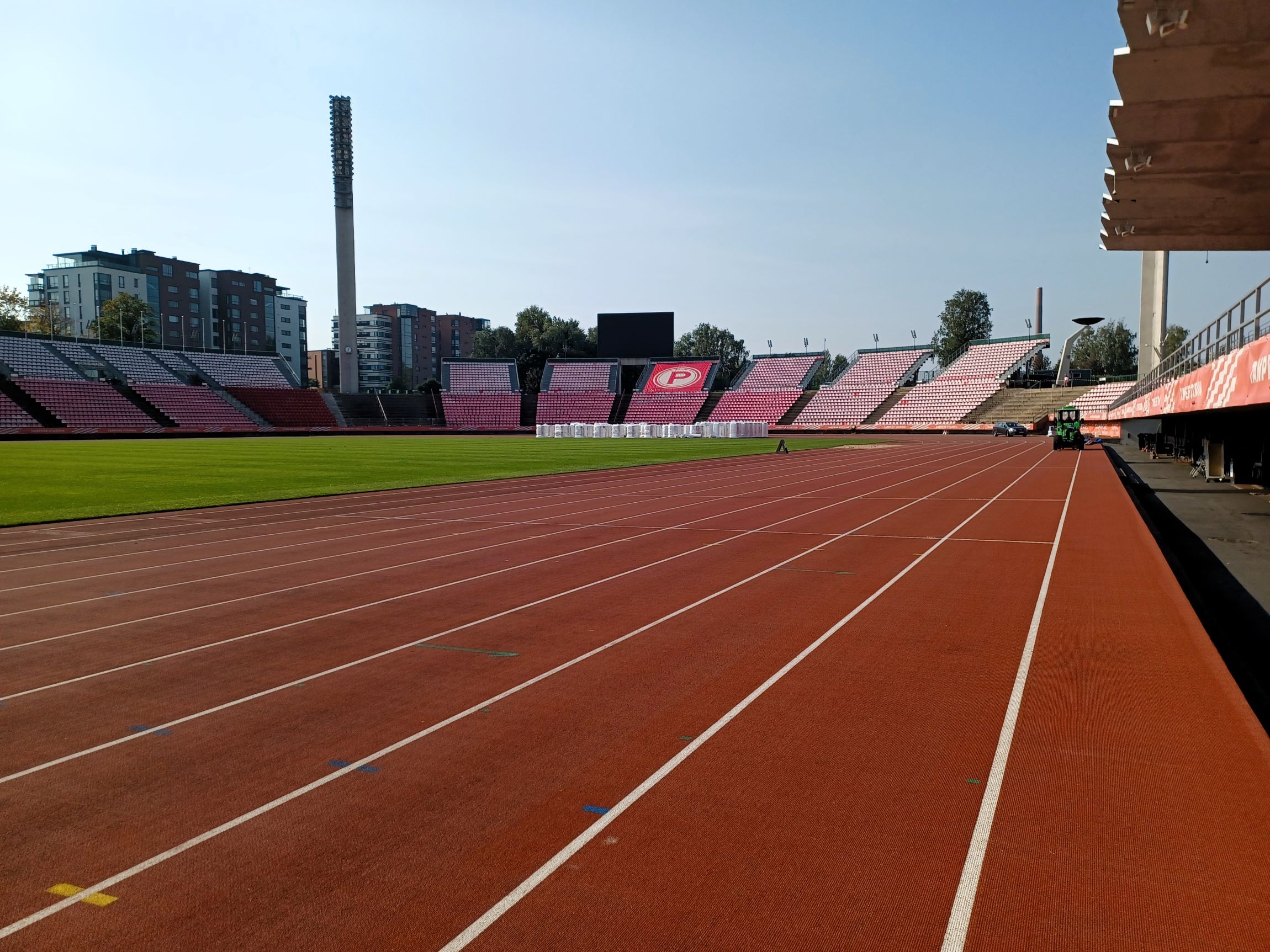 Tampereen stadionin kenttä on toistaiseksi poissa käytöstä juoksuradan korjausten vuoksi.