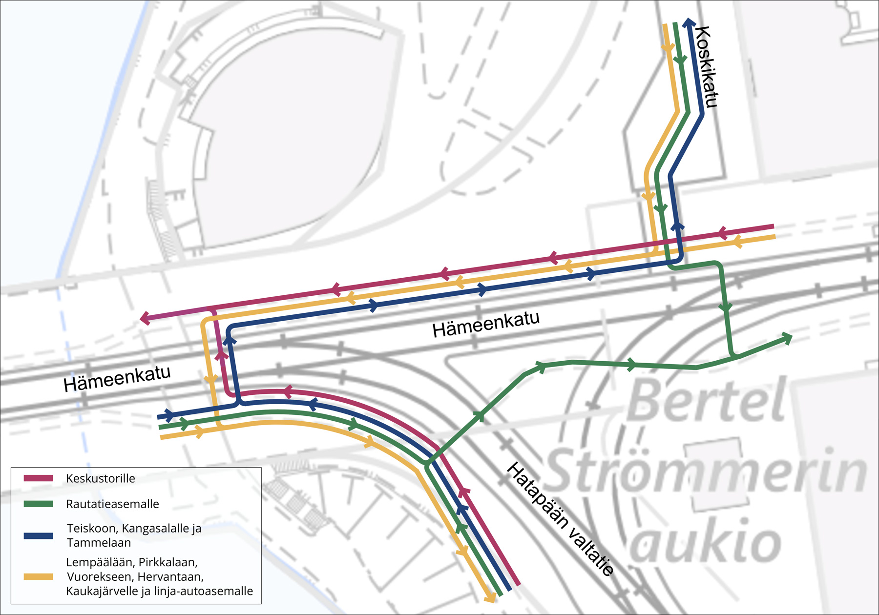 Tämän vuoksi esimerkiksi Kangasalle ei ohjata Hämeenkatua rautatieaseman suuntaan. Kangasalan pääreitti kulkee Rongankadulla, jonne pääsee Hatanpään valtatien risteyksestä opastusta seuraamalla. Hämeenkadun suuntaisesti opastetaan vain sen varrella oleviin kohteisiin eli Keskustorille ja Rautatieasemalle.