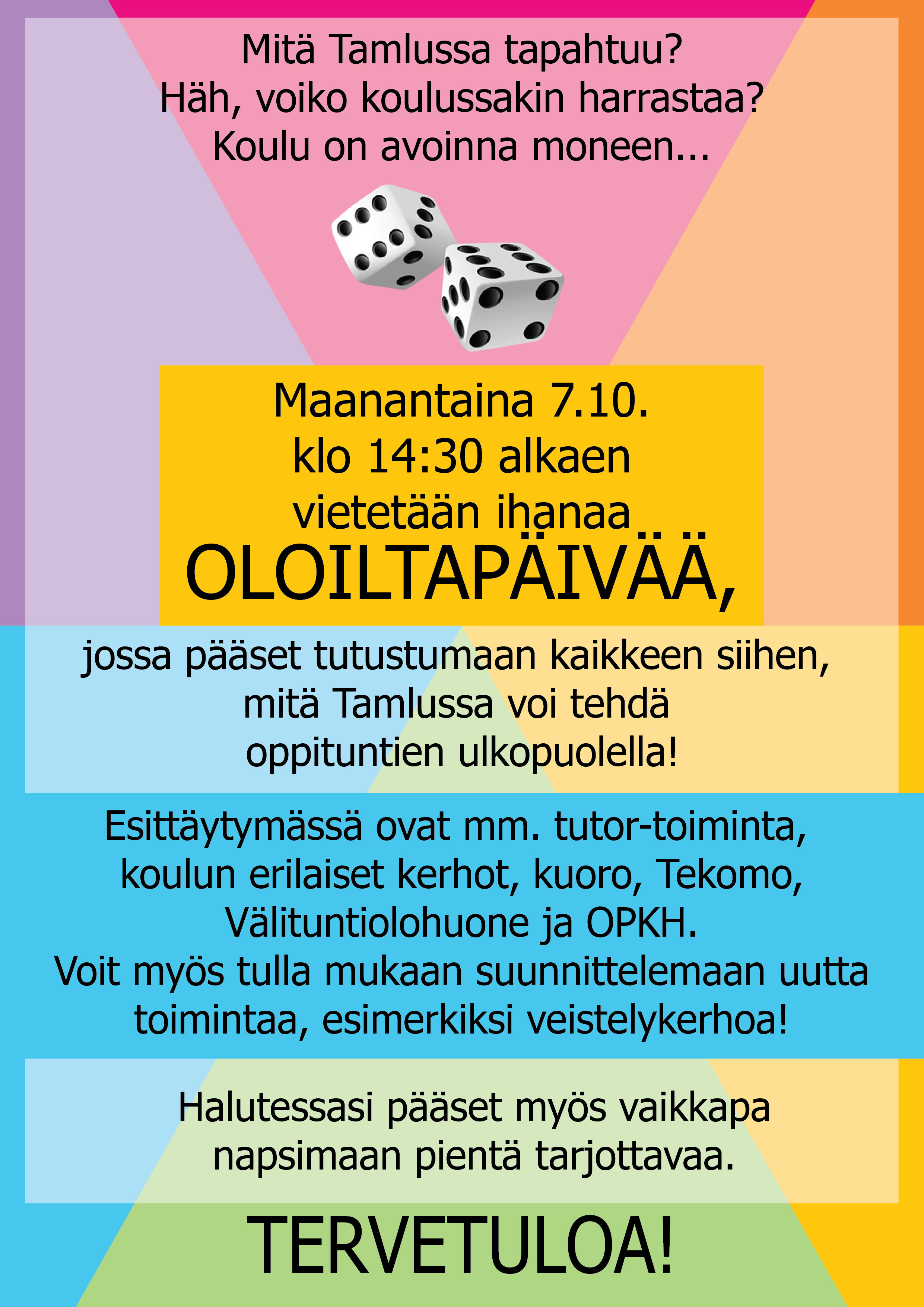 Maanantaina 7.10. kello 14:30 alkaen Tamlussa vietetään ihanaa oloiltapäivää, jossa pääset tutustumaan kaikkeen siihen mitä Tamlussa voi tehdä oppituntien ulkopuolella!