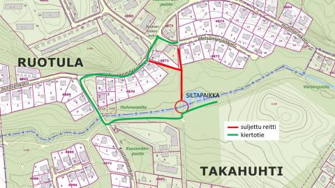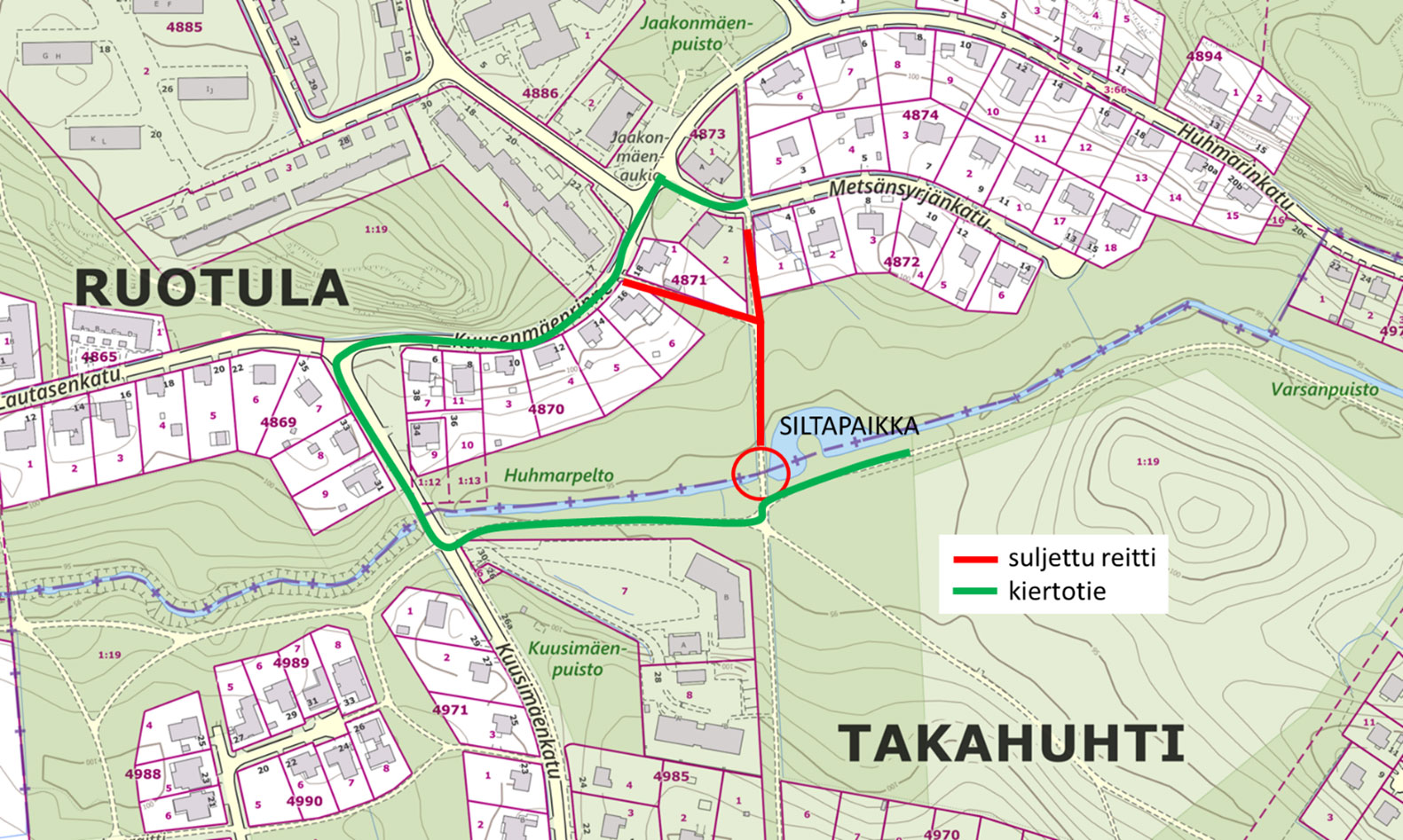 Takahuhdin Varsanpuistossa Vuohenojan vanha rumpuylitys korvataan puusillalla. Siltapaikalle johtavat puistokäytävät pohjoisesta Metsäsyrjänkadulta ja Kuusenmäenrinteeltä suljetaan töiden ajaksi ja kulkijat ohjataan läntiselle kiertoreitille Kuusimäenkadun kautta. Siltatyöt alkavat tiistaina 5.11. 2024 ja jatkuvat marraskuun loppuun asti.