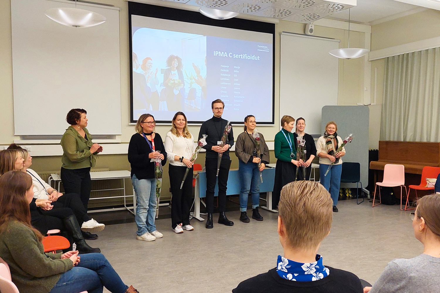 Tilaisuus päätti ensimmäisen ryhmämuotoisen IPMA C -sertifiointiprosessin Tampereella. Pilotoinnin ensivaikutelmat viestivät, että projektipäälliköiden koulutuspolun kehittäminen ja ryhmämuotoinen oppiminen voivat sekä vahvistaa kaupungin osaamista että edistää projektityöntekijöiden verkostoitumista.