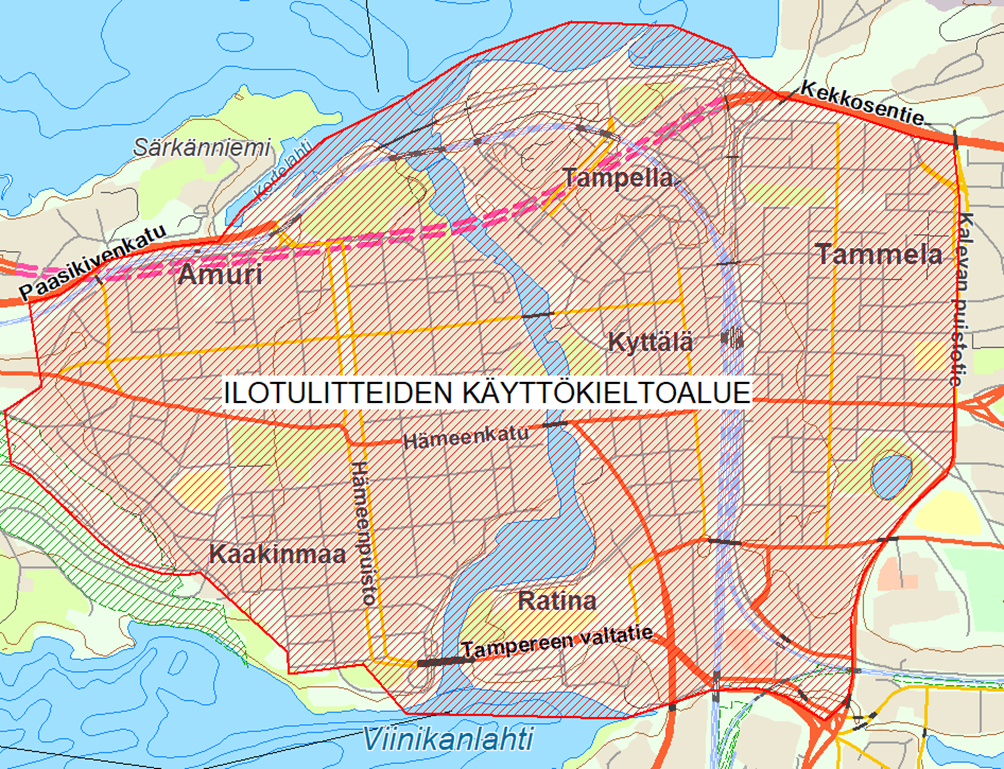 Ilotulitteiden käyttö on kielletty Tampereen ydinkeskustassa seuraavien katujen rajaamalla alueella: Kekkosentie - Kalevan puistotie - Viinikankatu - Tampereen valtatie - Jokikatu - Viinikanlahti - Eteläpuisto - Palomäentie - Näkötornintie - Vesilinnankatu - Paasikivenkatu - Kortelahti - Näsijärven ranta-alue - Kekkosentie.