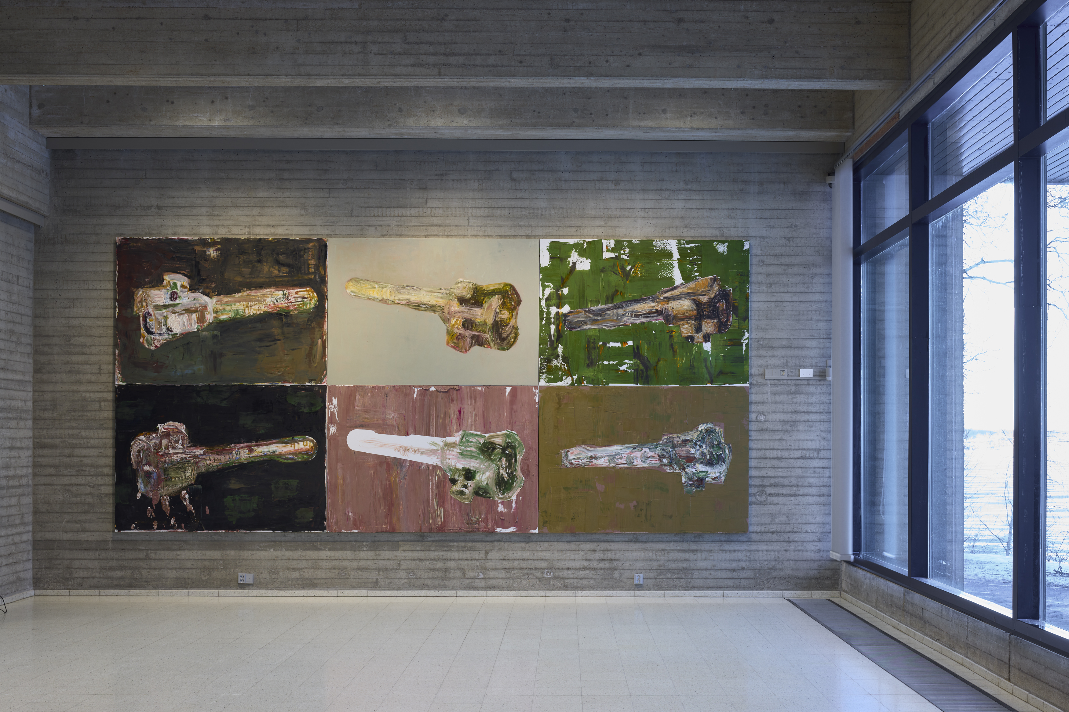 Museon alakerrassa on esillä aivan uusia kukka-aiheisia maalauksia sekä lisää vallan ja väkivallan tematiikkaan pureutuvia teoksia, jotka käsittelevät maailman ajankohtaista tilaa. Lukko-maalausten (2024) lähtökohtana on rynnäkkökiväärin lukko. Alakerrassa on esillä osa lähiöitä kuvaavasta sarjasta Kartat (2004–05).