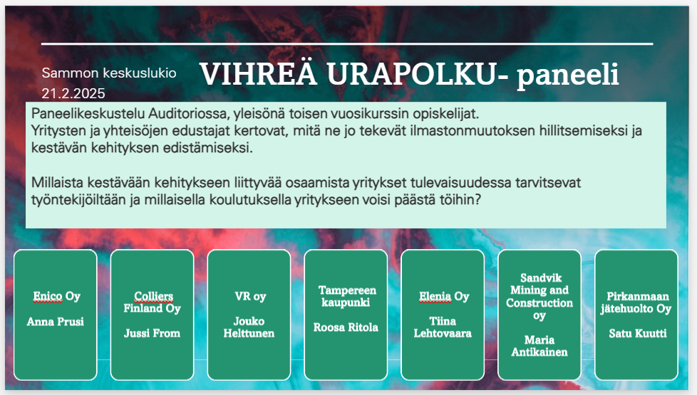 Vihreä urapolku -paneelikeskustelu järjestetään Samken auditoriossa 21.2.2025 klo 10 ja yleisönä ovat toisen vuosikurssin opiskelijat.