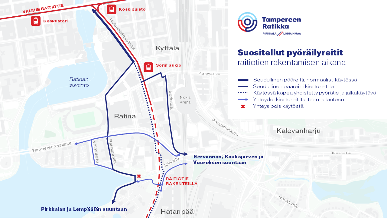Pyöräily-yhteys myös Hatanpään valtatietä, Tampereen valtatietä ja Nuolialantietä pitkin säilyy ja palvelee edelleen alueiden sisäisillä matkoilla. Reitillä on käytössä tilapäiset järjestelyt.