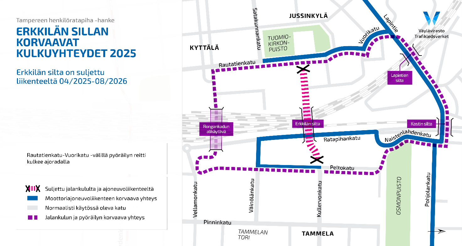 Rakentamistöiden ajaksi Erkkilänkatu suljetaan liikenteeltä Peltokadun ja Rautatienkadun väliseltä alueelta. Moottoriajoneuvot ohjataan käyttämään Sorinsiltaa ja Lapintietä. Myös Itsenäisyydenkadun alikulku on autoilijoiden käytettävissä ennen ja jälkeen kesän sulun 2.6.–5.8.2025.