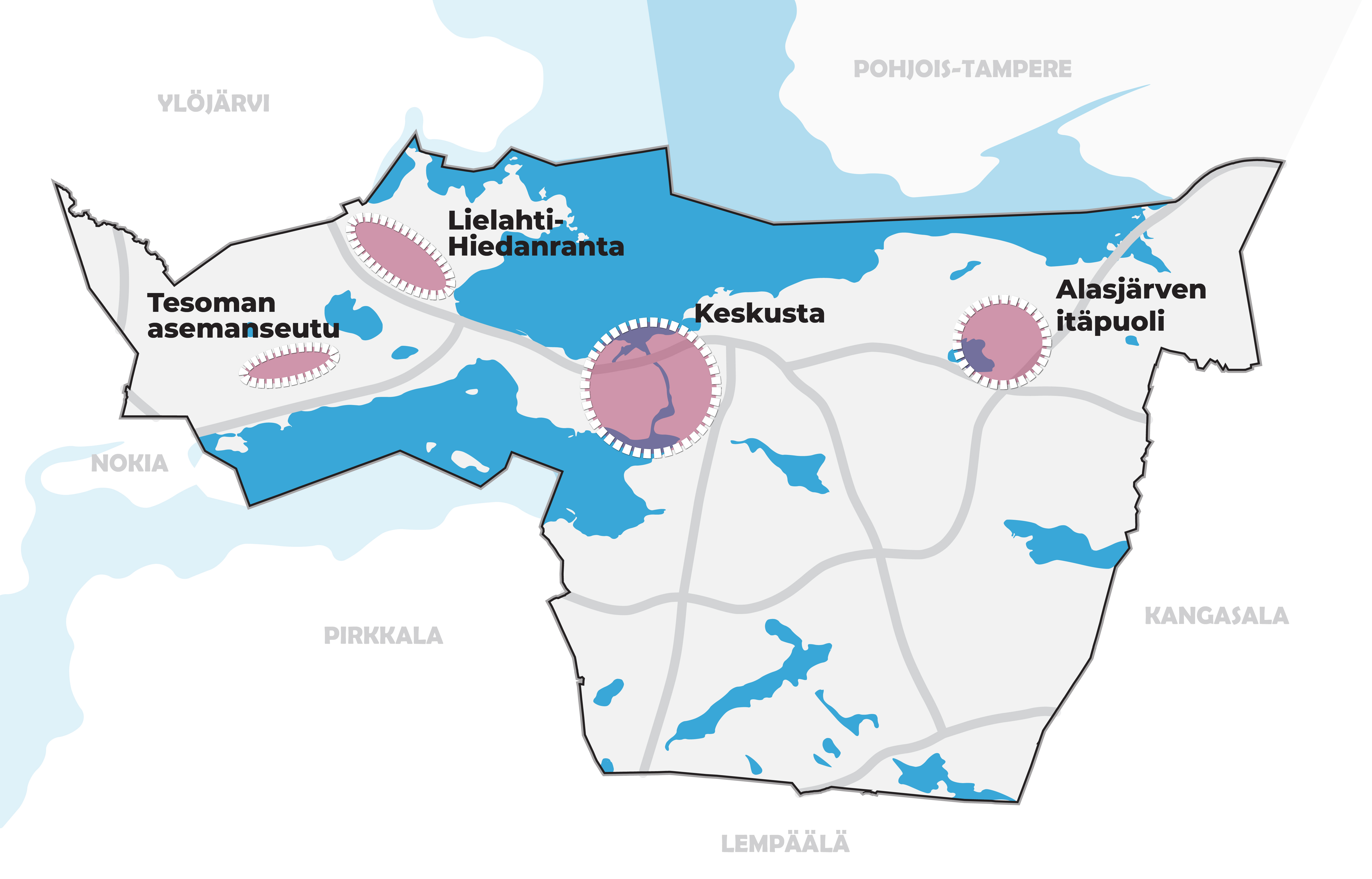 Vaiheyleiskaavassa esitetään yksityiskohtaiset maankäytön kehittämisperiaatteet Tesoman asemanseudulle, Lielahti-Hiedanrannan alueelle, Keskustan osa-alueelle ja Alasjärven itäpuolelle.