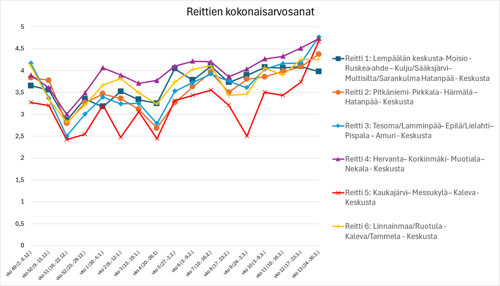 Hervannan ja keskustan välinen agenttireitti sai parhaan kokonaisarvosanojen keskiarvon (4,0). Kaukajärven ja keskustan välinen agenttireitti numero 5 sai puolestaan heikoimman arvosanan (keskiarvo 3,2).