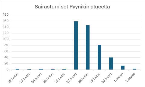 Tampereen kaupungin ympäristöterveys ja Pirhan tartuntatautien valvonta jatkavat edelleen Pyynikin alueella ilmenneen vatsatautiepidemian syyn selvittämistä. Perjantaihin 2.5.2025 mennessä kaupungin ympäristöterveyteen tuli ilmoituksia noin 450 sairastuneesta henkilöstä Pyynikin alueella.