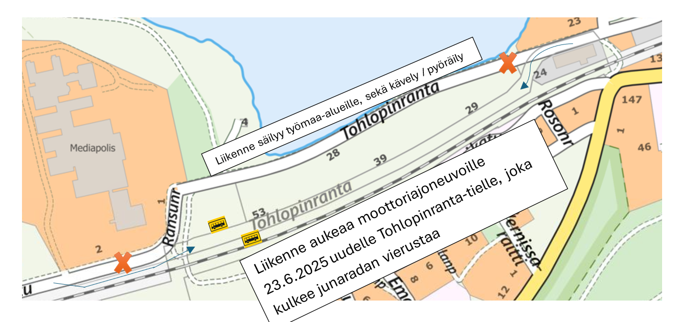 Moottoriajoneuvoliikenne kulkee uutta Tohlopinranta-katua ja Kohmankatua. Yhteys Mediapolikselle on vanhan Tohlopinranta-kadun kautta.