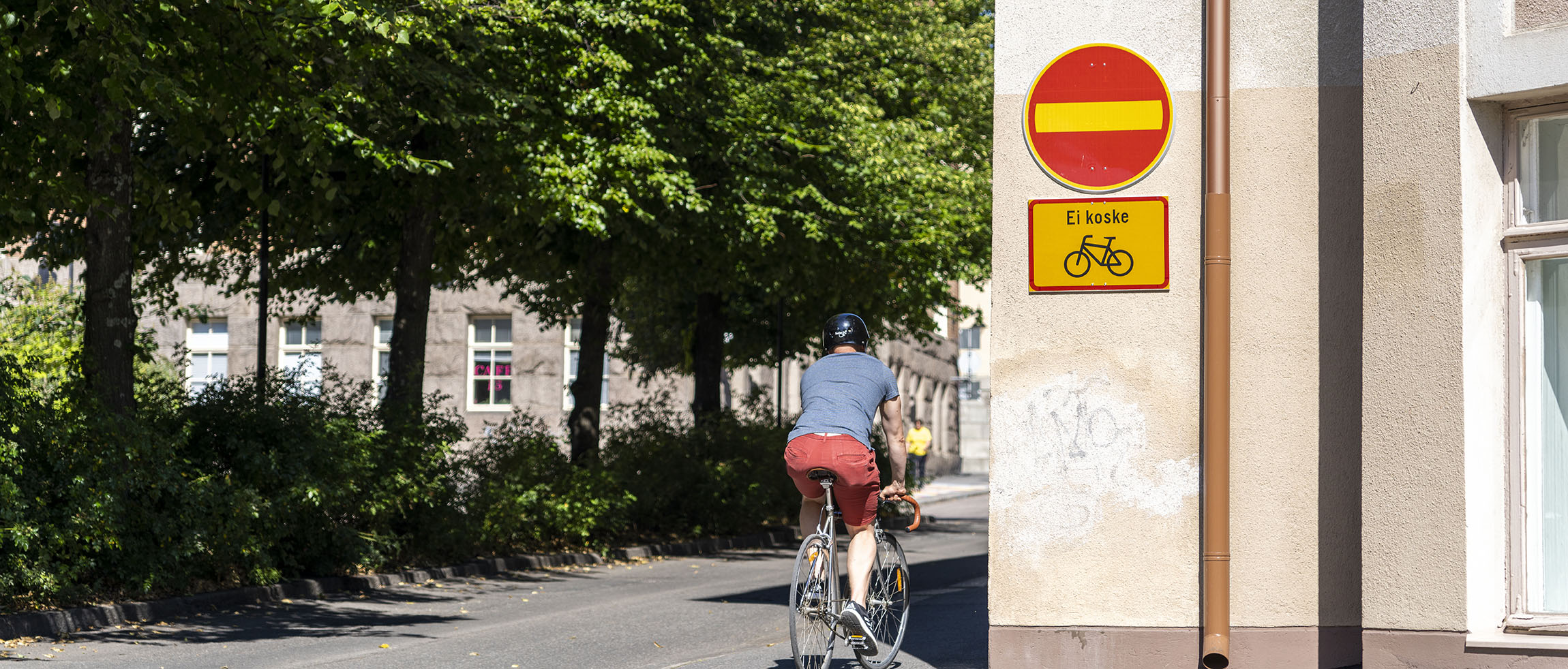 Yksisuuntaisella kadulla saa pyöräillä kahteen suuntaan, jos se on liikennemerkillä sallittu. Näin pyöräilijä saa ajaa katua molempiin suuntiin ajoradalla. Kuva: Jukka Salminen.