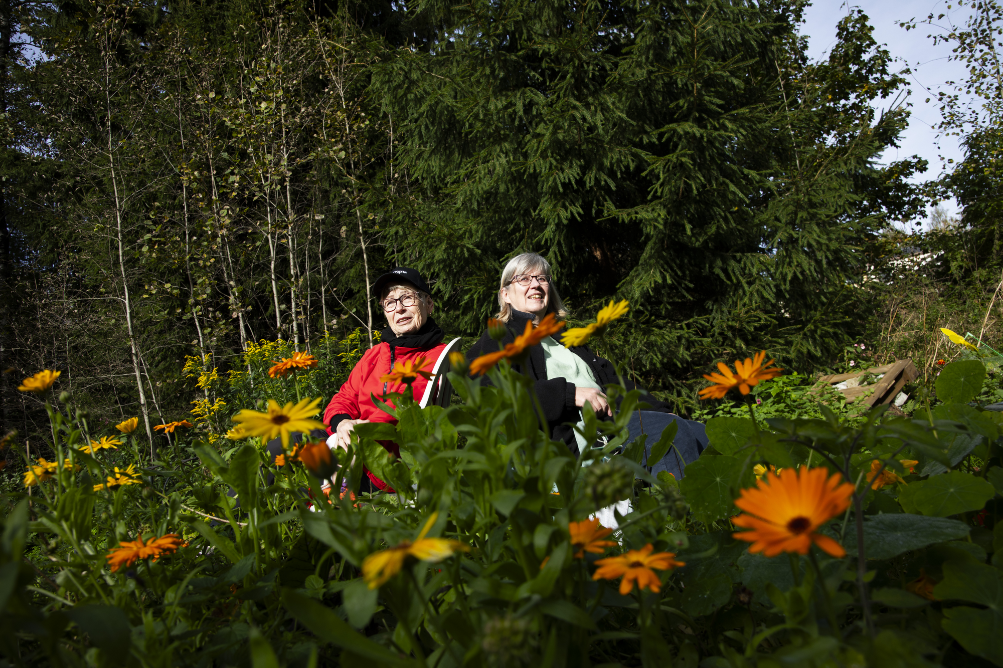 Riitta Reponen ja Irma Hellsten tarkastelevat viljelylaatikkoon toukokuussa Tesoman naapurustojuhlassa istutettuja niittykukkia. Kukat kukoistavat vielä syyskuun loppupuolella, mutta Riesa-Pellen istuttama oregano vaikuttaa jo vähän nuupahtaneelta.