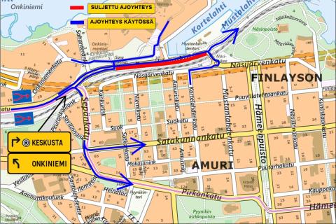 Liikennejärjestelyn ajan ajoyhteys keskustaan on käytössä Satakunnankadun sekä Pirkankadun kautta. Ranta-Tampellaan kulkureitti lännestä kiertää Kortelahdenkadun kautta (Sepänkatu-Satakunnankatu-Kortelahdenkatu ja Näsijärvenkatu).