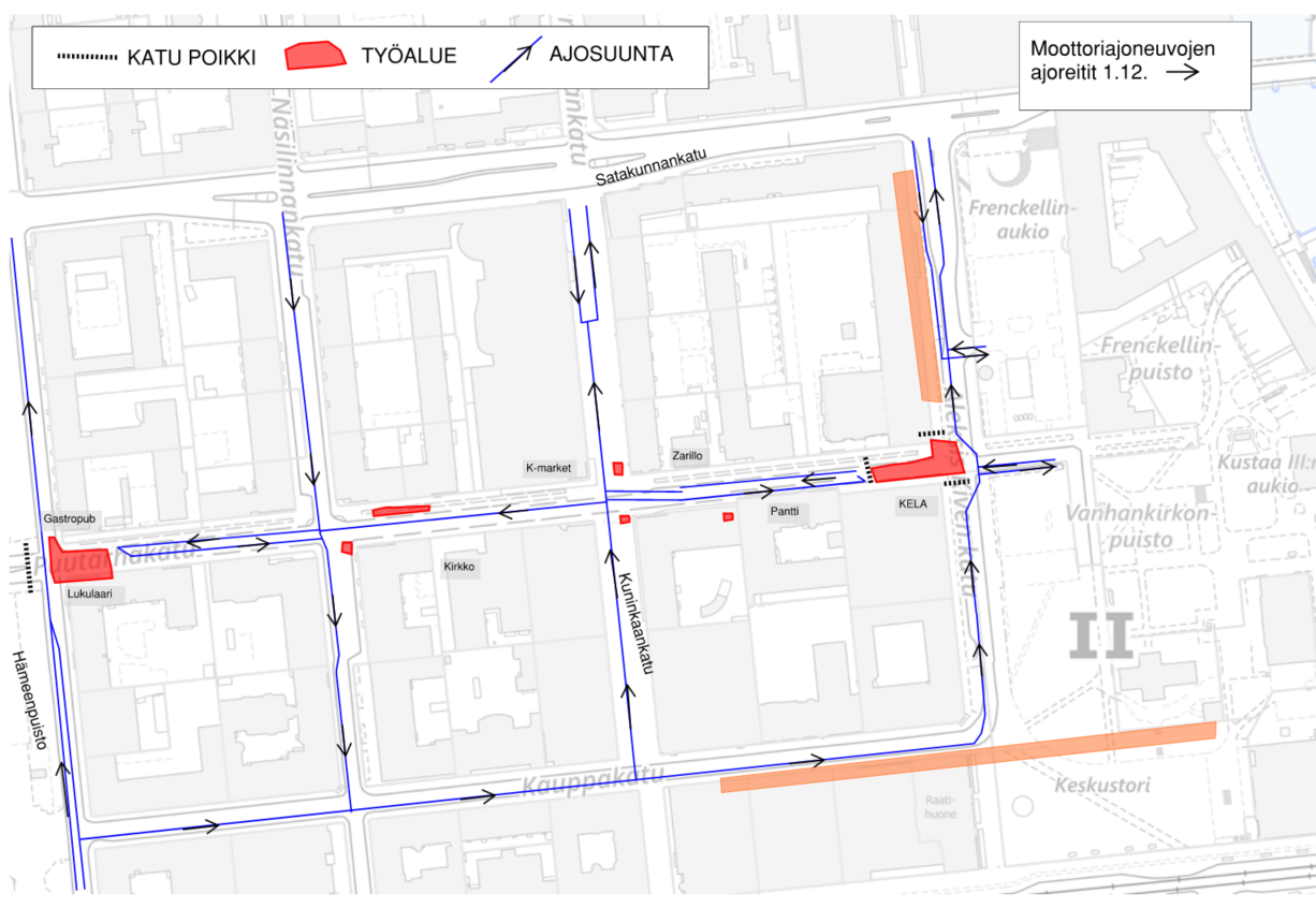 Puutarhakadulla kaivannot ja muut työalueet rajoittavat moottoriajoneuvojen kulkua. Kevyelle liikenteelle Puutarhakatu on kuljettavissa läpi, mutta käytettävät reitit muuttuvat työalueiden siirtyessä ja pyydämme noudattamaan opasteita ja ohjeistettuja reittejä. Läpiajo Hämeenpuistoon on suljettu.