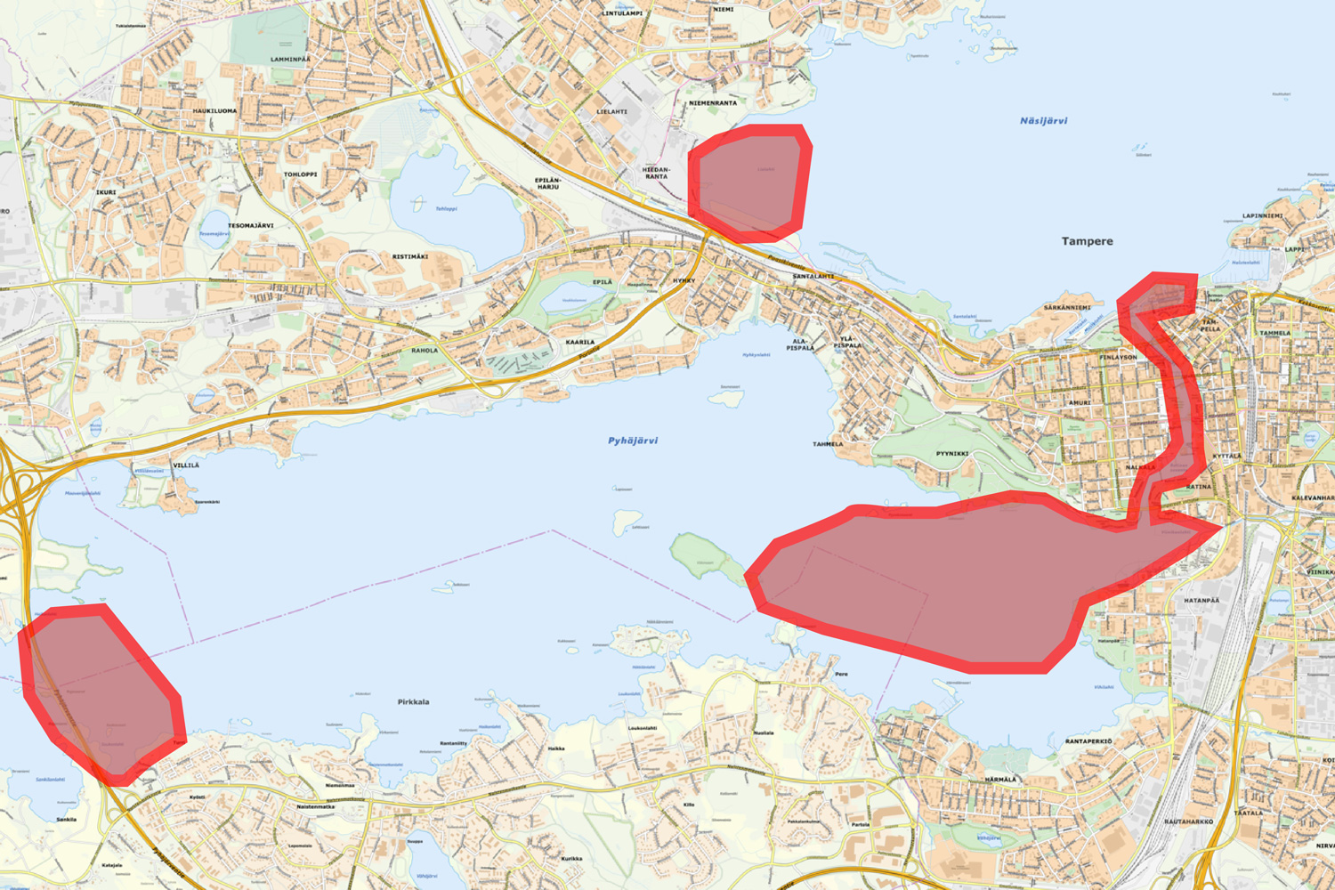 - Pyhäjärven keskustanpuoleinen allas eli Viinikanlahti sekä Pyynikin, Eteläpuiston, Hatanpään ja Viikinsaaren välinen alue