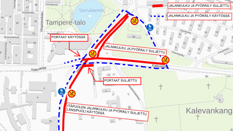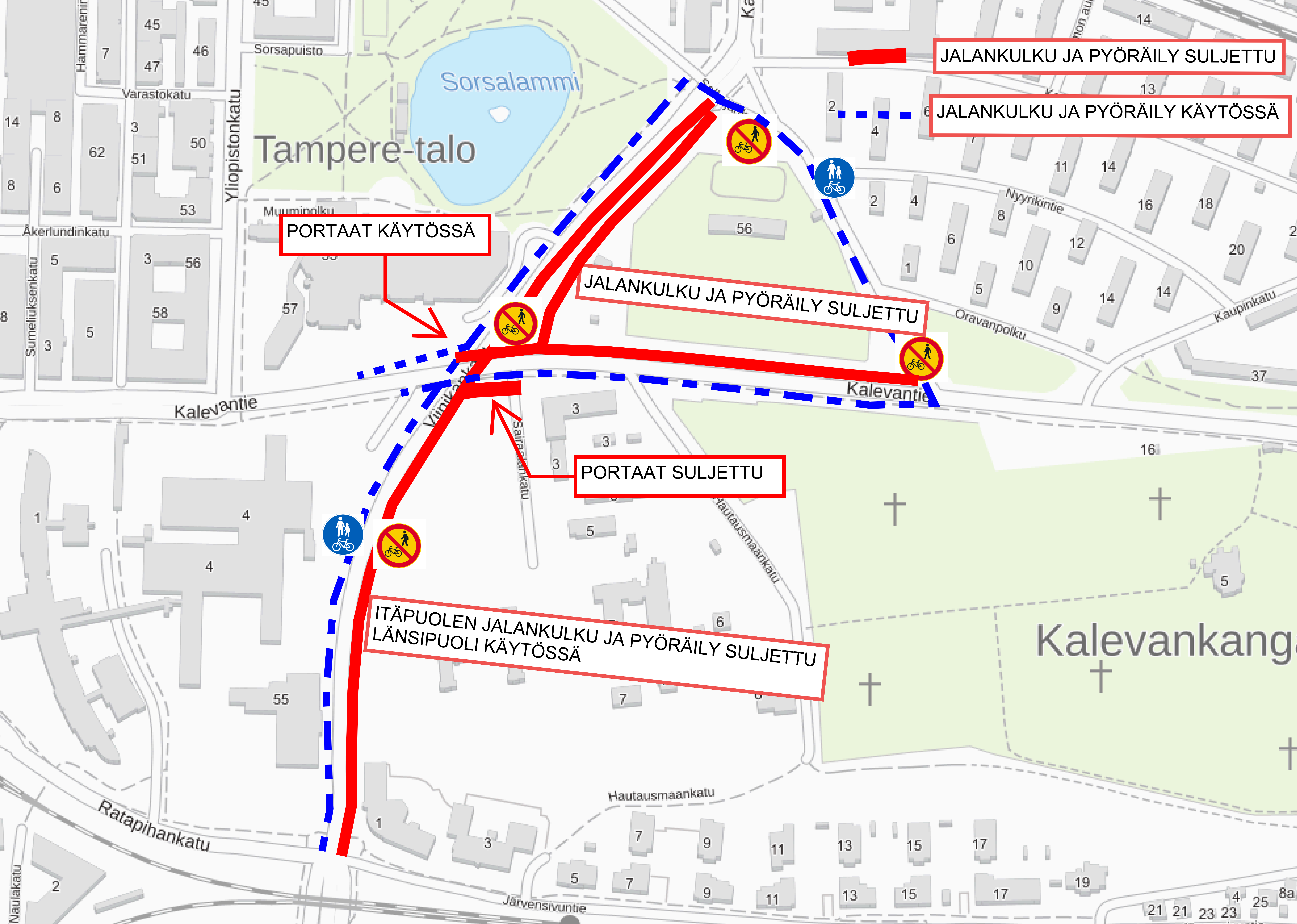 Kävely ja pyöräily on Viinikankadulla, Viinikankadun polulla Kalevantien ja Salhojankadun välillä sekä Kalevantien pohjoisreunalla korvaavilla yhteyksillä toukokuun loppuun saakka. (Klikkaamalla saat kartan näkymään kokonaan).