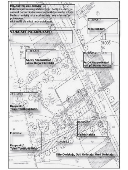Naapurikuulemisen tarve ja laajuus riippuvat hankkeen ominaisuuksista. Rakennusvalvonta määrittelee naapurikiinteistöt, joita kunkin hankkeen kohdalla naapureina kuullaan. Hankkeeseen ryhtyvä voi tämän jälkeen kuulla heitä alla mainitun ohjeen mukaisesti. Mikäli luvan hakija ei ole selvillä naapurikiinteistöjen omistajista tai haltijoista, kiinteistöjä koskevan omistajaselvityksen voi tilata kunnalta. Kunta perii omistajaselvityksistä taksan mukaisen maksun.