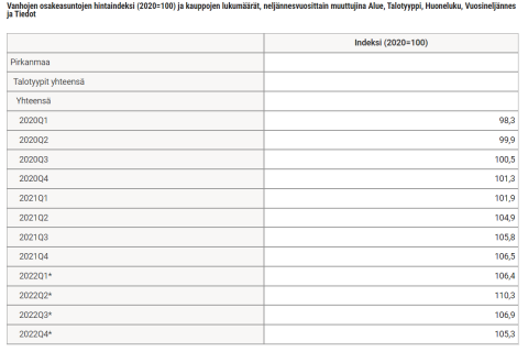 Oheisessa kuvassa voi tutustua 10.3.2023 tarkistettuihin indeksiarvoihin. Tiedon voi tarkistaa Tilastokeskuksen sivulta: vanhojen osakeasuntojen hintaindeksi