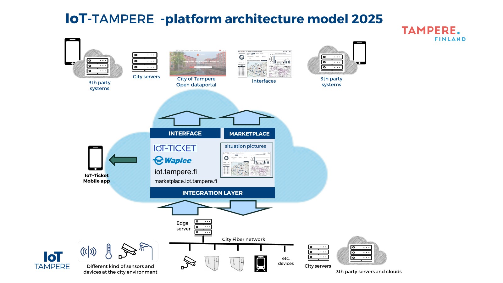 Tampereen kaupungin IoT-alusta on pilvipohjainen ja se on liitetty paikalliseen reunalaskentapalvelimeen, mikä mahdollistaa erilaisia sovelluksia monenlaisille aloille ja erilaisiin tarpeisiin.
