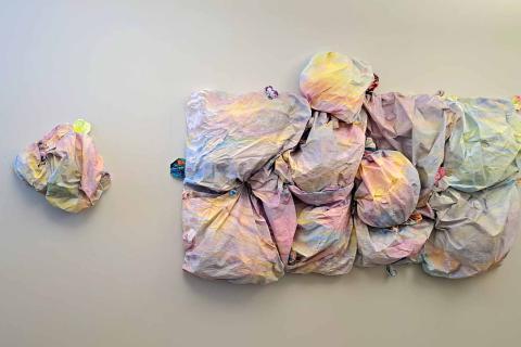 All of the materials used in the work could have ended up in the trash. Now, together, they have taken on a new form, after which they will continue their lives as materials for new stories. The work uses materials such as painting felt and disposable tablecloths. The colors used are ecological gouache paints, watercolors, beetroot, spirulina, saffron, and food coloring.