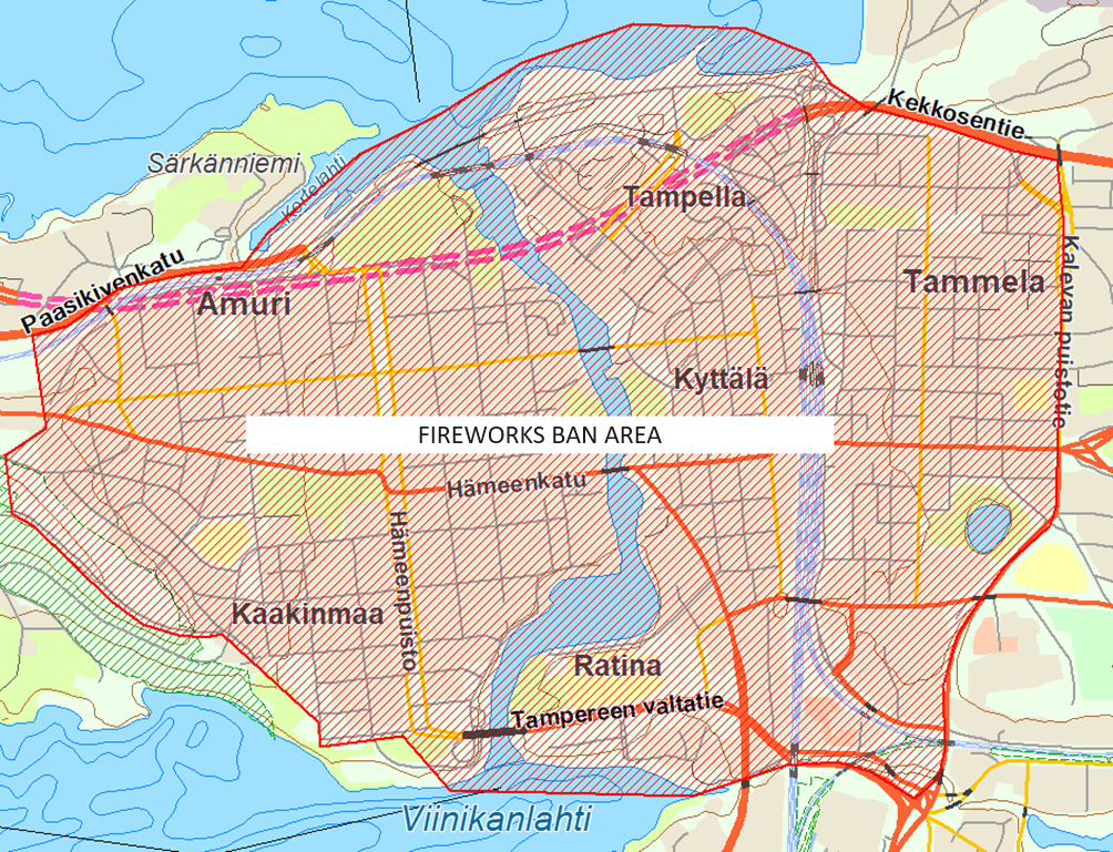 The use of fireworks is prohibited in Tampere city centre in the area bounded by the following streets: Kekkosentie - Kaleva Park Road - Viinikankatu - Tampereen valtatie - Jokikatu - Viinikanlahti - Eteläpuisto - Palomäentie - Näkötornintie - Vesilinnankatu - Paasikivenkatu - Kortelahti - Näsijärvi waterfront area - Kekkosentie.