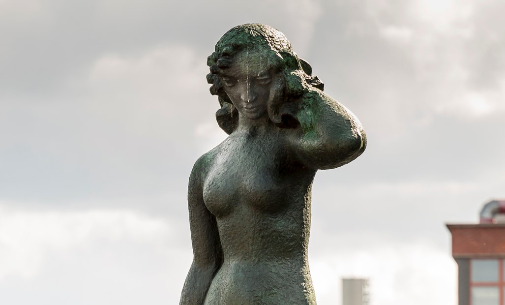 The only female figure among the Hämeensilta sculptures, the Maiden of Finland, is an idealized and vigorous Venus-like figure symbolizing a mythical ideal rather than a real person. She has also been interpreted as a Finnish counterpart to the ancient Greek goddess Athena, associated with wisdom and knowledge. Aaltonen frequently revisited the same themes in his sculptures, creating variations in different sizes and materials. A plaster version of the Maiden of Finland was once selected as the world’s most beautiful sculpture at the 1939 New York World’s Fair. The bronze version has also been exhibited internationally, including in Essen, Germany and Zurich, Switzerland.