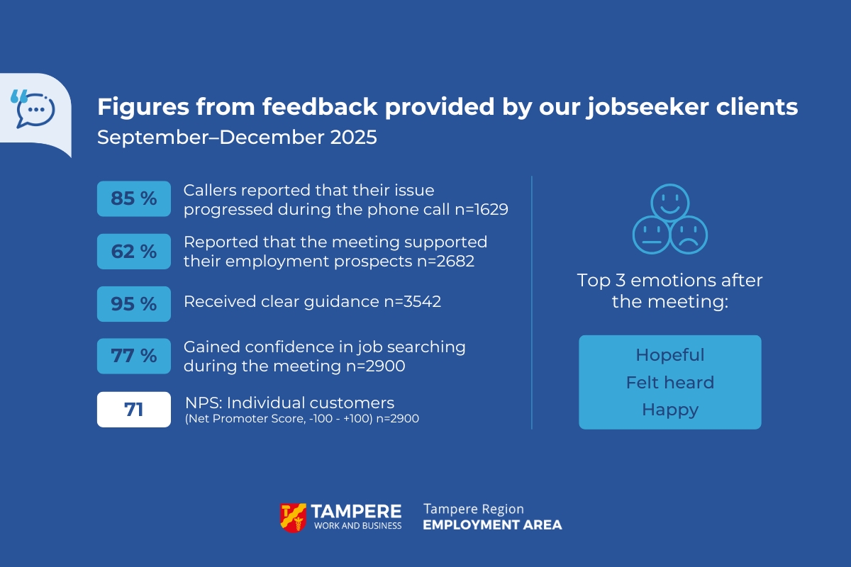 The Tampere Region Employment Area collects feedback from job seekers systematically at different stages of the service path – from telephone counselling to job search discussions. The feedback is used to improve services, with the aim of developing even more customer‑oriented and streamlined service experience. Emotions are also measured: how the interaction felt and what kind of impression it left.