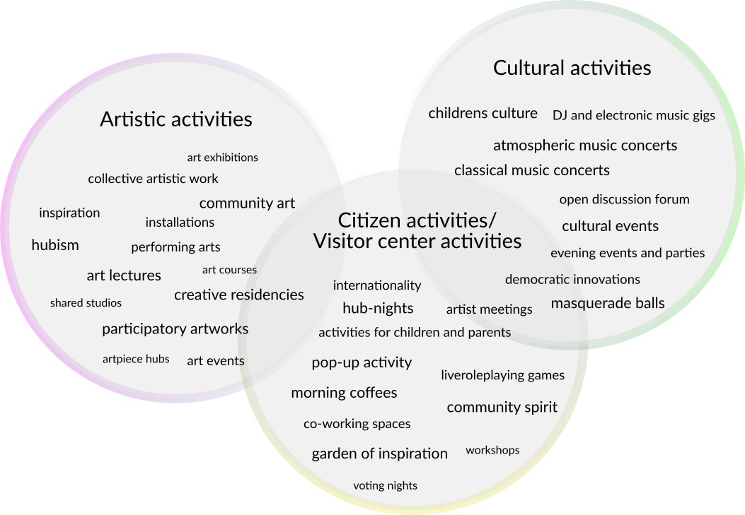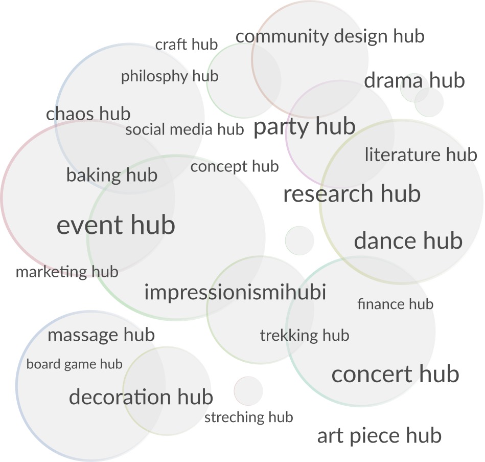 Hubism is a semi-humorous art form of community planning developed for the concept, characterized by multi-perspectivity and polyphony, as well as fun and enjoyment. Hubs are small groups or community bubbles that produce or engage in activities. Community members can join various hubs or create their own based on their interests or inspiration. Some hubs may be permanent, such as production, party, research, and art hubs.