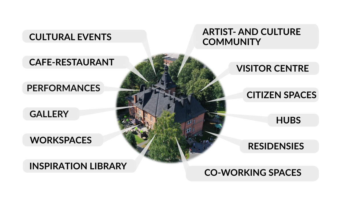 The historical and beautiful manor offers a place to visit Hiedanranta year-round. Visitors to the new cultural center can attend various cultural events, participate in the manor's communal activities, meet local artists, learn about the area's history, development phases, and the construction of the future district. In addition to innovative cultural activities, the manor also serves as a place for city residents to meet and live. Special resident spaces are being created to support networking and community building.