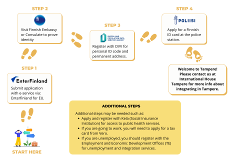 Step 3: Register with the Digital and Population Data Services Agency (also known in Finland as the DVV). Upon arrival in Finland, make an appointment to register with DVV for a personal identity code (if not given along with your resident permit) and register your temporary or permanent address in Finland. Permanent address means the address you are living long-term here in Tampere for one year or more. Instructions on the application process can be found on Registration of a foreigner - Digital and Population Data Services Agency (dvv.fi). You can fill up the form before the appointment but please DO NOT sign the form or write the date before your appointment. You have to sign the form in front of DVV during your appointment.
