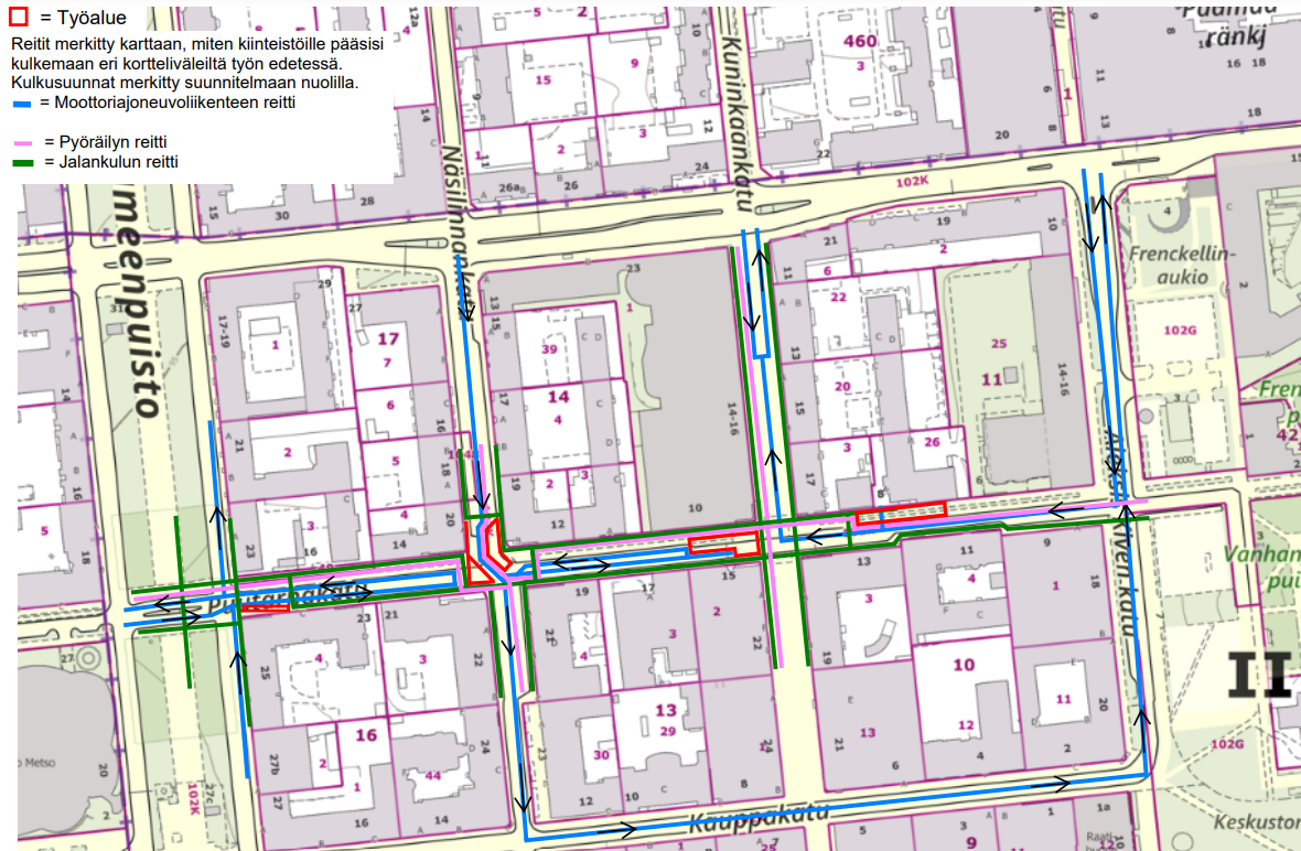 Kaivannot ja muut työalueet rajoittavat moottoriajoneuvojen kulkua Puutarhakadulla. Jalankululle ja pyöräilylle Puutarhakatu on läpi kuljettavissa, mutta käytettävät reitit muuttuvat työalueiden siirtyessä. Noudata opasteita ja ohjeistettuja reittejä. Karttakuvassa on esitetty moottoriajoneuvojen ajoreitit.