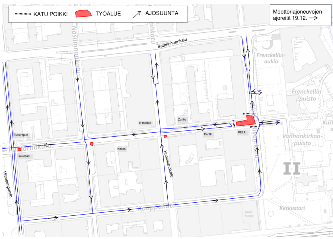 Aleksis Kiven katu on muutettu yksisuuntaiseksi Kauppakadulta Satakunnankadun suuntaan siten, että Satakunnankadulta pääsee ajamaan Frenckellinaukion parkkihallin pysäköintiin, mutta ei pidemmälle.