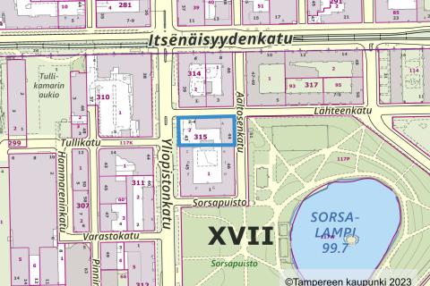 Kaava-alue sijaitsee keskustassa Tullin (XVII) kaupunginosassa. Asemakaavamuutos koskee korttelin 315–2 tonttia. Kaava-alue rajoittuu pohjoisessa Lähteenkatuun, lännessä Yliopistonkatuun, idässä Aaltosenkatuun ja etelässä korttelin muihin tontteihin. Katuosoite on Lähteenkatu 2–4. Täydennysrakentamisen yhteydessä pyritään lisäämään ulko-oleskelutiloja ja niiden viihtyisyyttä. Pysäköinti sijoitetaan ensisijaisesti maan alle. Kadun varren rakennusten ensimmäiset kerrokset säilytetään liike- ja palvelukäytössä.