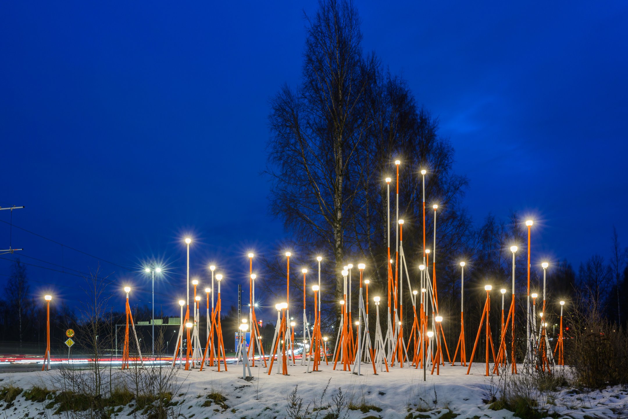 Kaupunkitilassa olevia valotaideteoksia ja valaistuja taideteoksia ovat muun muassa