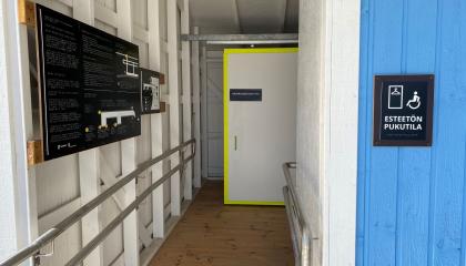 Esteettömällä uimarannalla on oma pukuhuone, joka sopii kaikille sukupuolille. Pukuhuoneen ovessa on haka, jolla oven voi sulkea vaatteiden vaihdon ajaksi. Pukuhuoneessa on pukukaappeja.