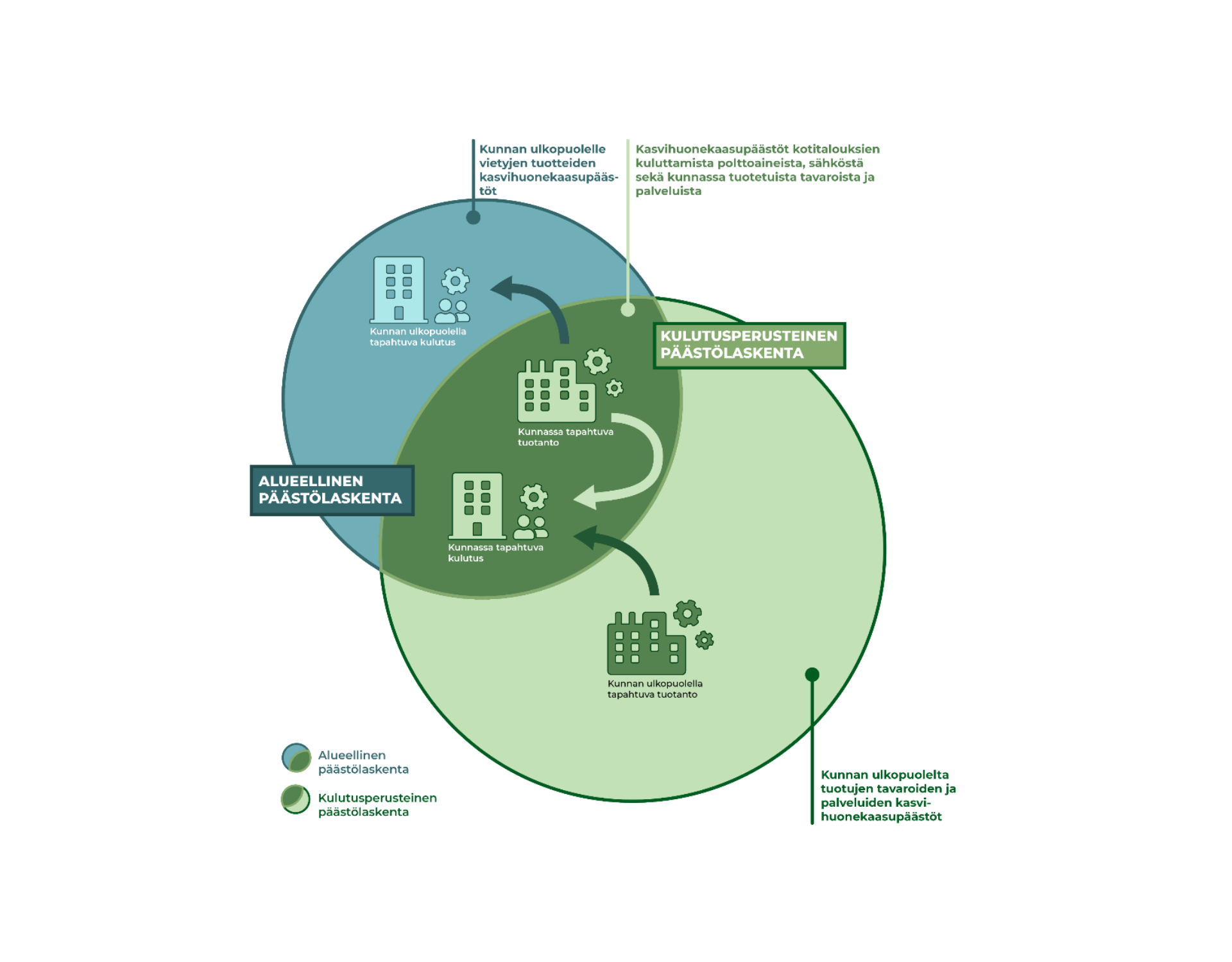 Mukana laskennassa ovat kuluttajien ja teollisuuden sähkönkulutus, sähkölämmitys, maalämpö, kaukolämpö, erillislämmitys, teollisuus ja työkoneet, tieliikenne, maatalous sekä jätehuolto.