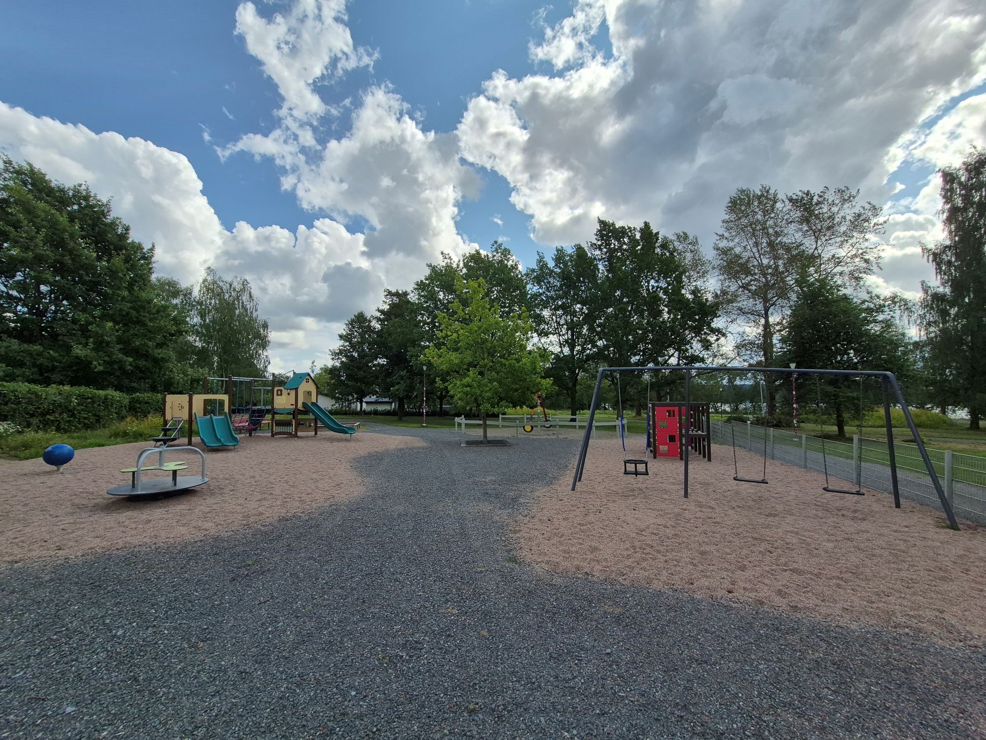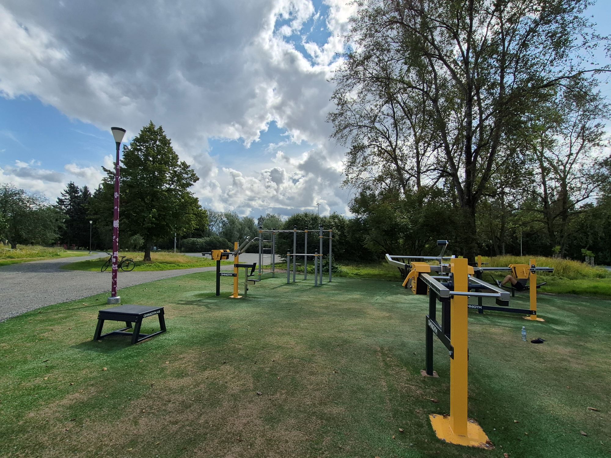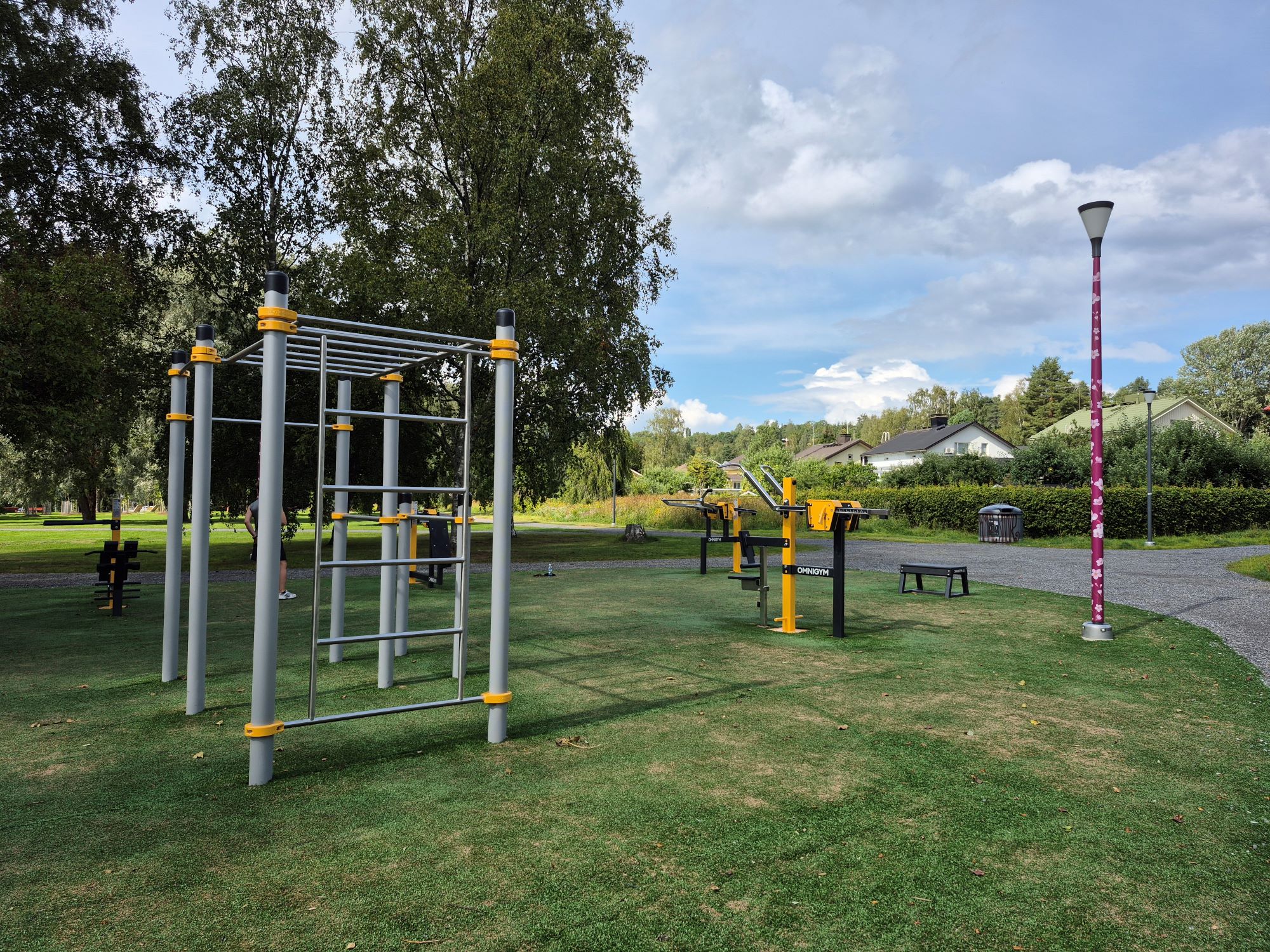 Erilaisilla ulkokuntosalilaitteilla varustettu kuntoilupiste. Salilta löytyvät Omnigymin laitteet: