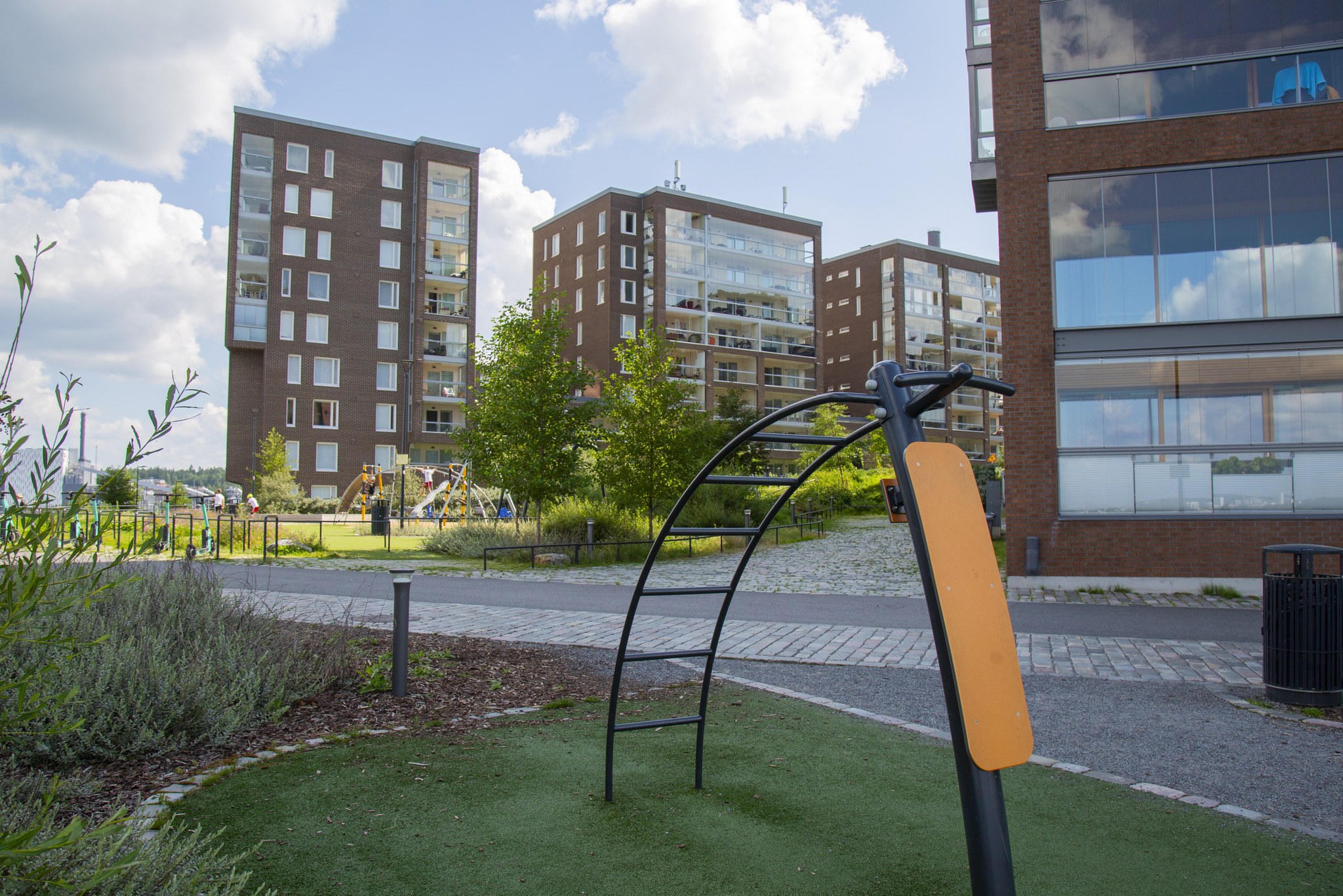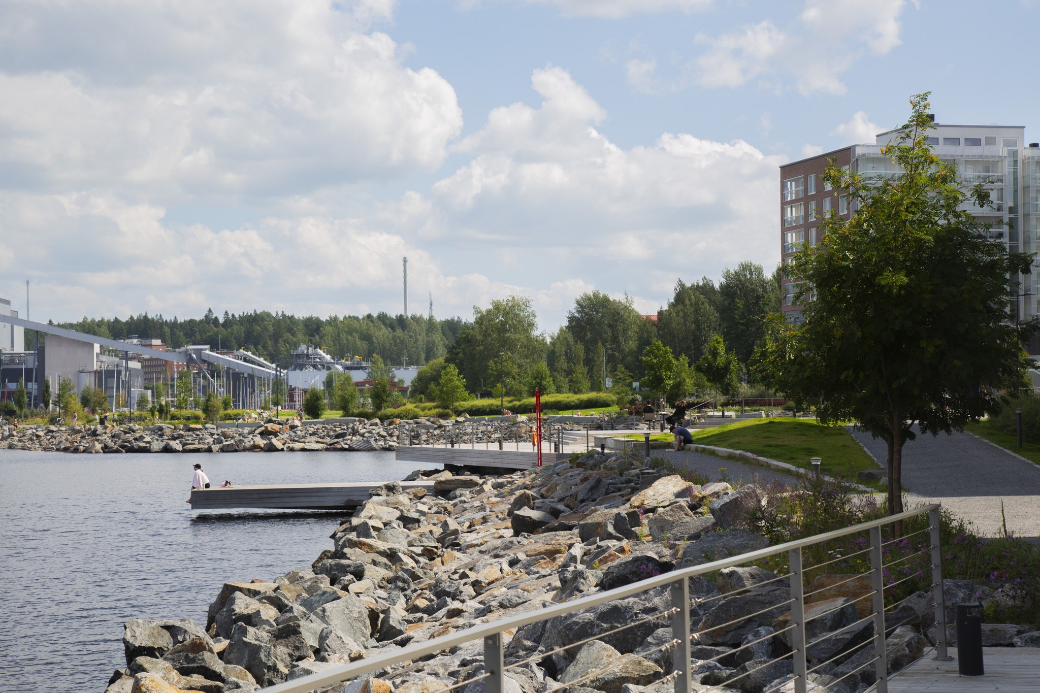 Lähempänä kerrostaloaluetta kulkee seudullinen jalankulku- ja pyörätie ja alempana rannan tuntumassa rantareitti, jonka varrelta pääsee veden äärelle. Puiston keskivaiheilla, laiturilla on tuoli- ja pöytäryhmiä sekä kahvila, ja laiturin kohdalla kortteleiden välissä on leikkipaikka. Rannassa on myös nurmialueita oleskeluun sekä ulkokuntosali.