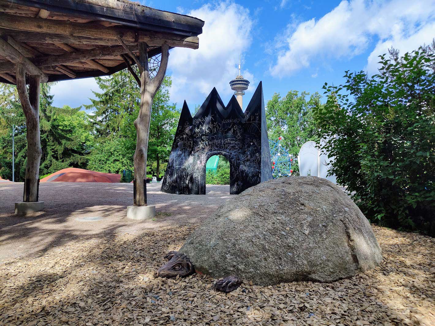 Hyppelyyn, liukuun ja kiipeilyyn löytyy sopivia paikkoja ja välineitä kuten kiipeilyverkko, jonka alustana on tähtitaivas. Leikkipaikan toisella laidalla on värikäs kumpareinen alue, jossa on trampoliineja ja liukumäkiä.
